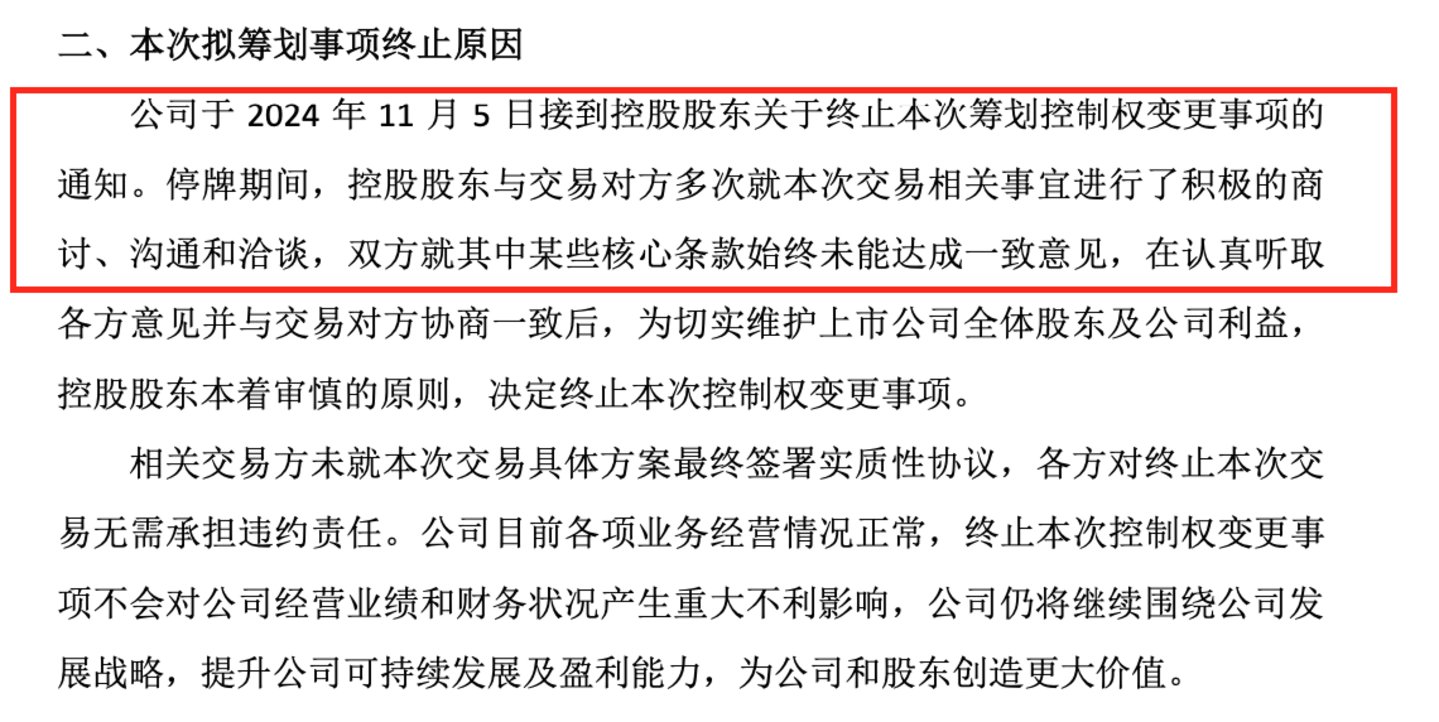 11月5日,公司突然宣布当日接到控股股东关于终止本次筹划控制权变更事项的通知,公司表示“停牌期间,控股股东与交易对方多次就本次交易相关事宜进行了积极的商讨、沟通和洽谈,双方就其中某些核心条款始终未能达成一致意见”。