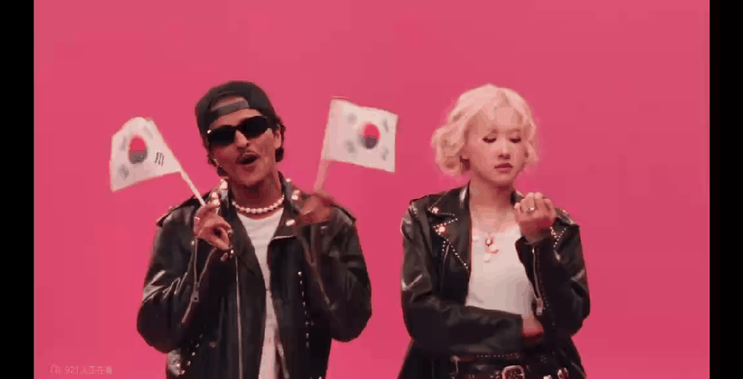 这种复古加搞怪的视频风格,也完全贴合当下的互联网社交属性,几乎每一帧都可以当做表情包使用。有意思的是,在欧美经典复古元素站整个作品大比例的情况下,火星哥拿出了两面韩国国旗。