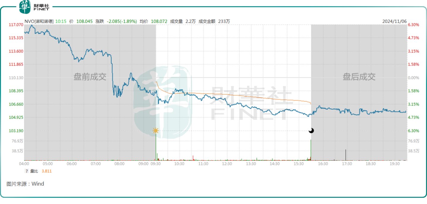 从资本市场的反馈来看,诺和诺德的美股在11月6日(当地时间)盘前一度涨逾6%,但最终遭遇下跌,截至收盘跌幅为4.33%。