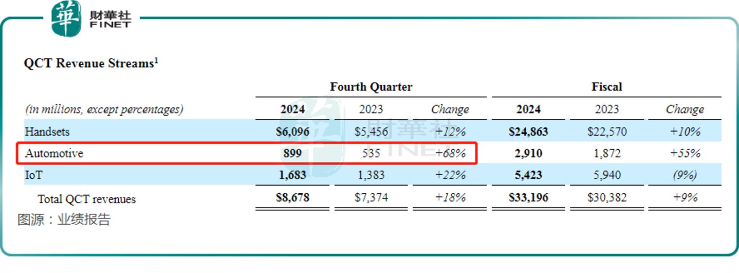 此外,第四财季,汽车芯片的营收同比增长68%至8.99亿美元,增势迅猛,远超预期。高通表示,目前公司与汽车制造商的合作项目价值数十亿美元,并强调这是连续第五个季度汽车业务实现增长。