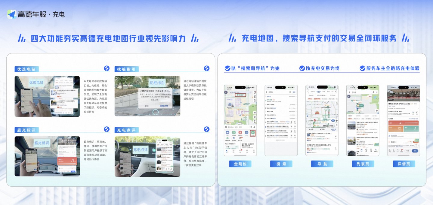 在此背景下,高德车服充电业务在高德地图聚合产业生态的支持下迅速成长,成为国内领先的全网找桩决策导航服务平台。其充电地图覆盖的新能源车主已超2400万,在线公共站点超过22万,公共充电站覆盖率高达98.5%,日均提供500万次的充电站搜索、导航、到站服务,成功构建了一张庞大且动态的充电站数据网络。