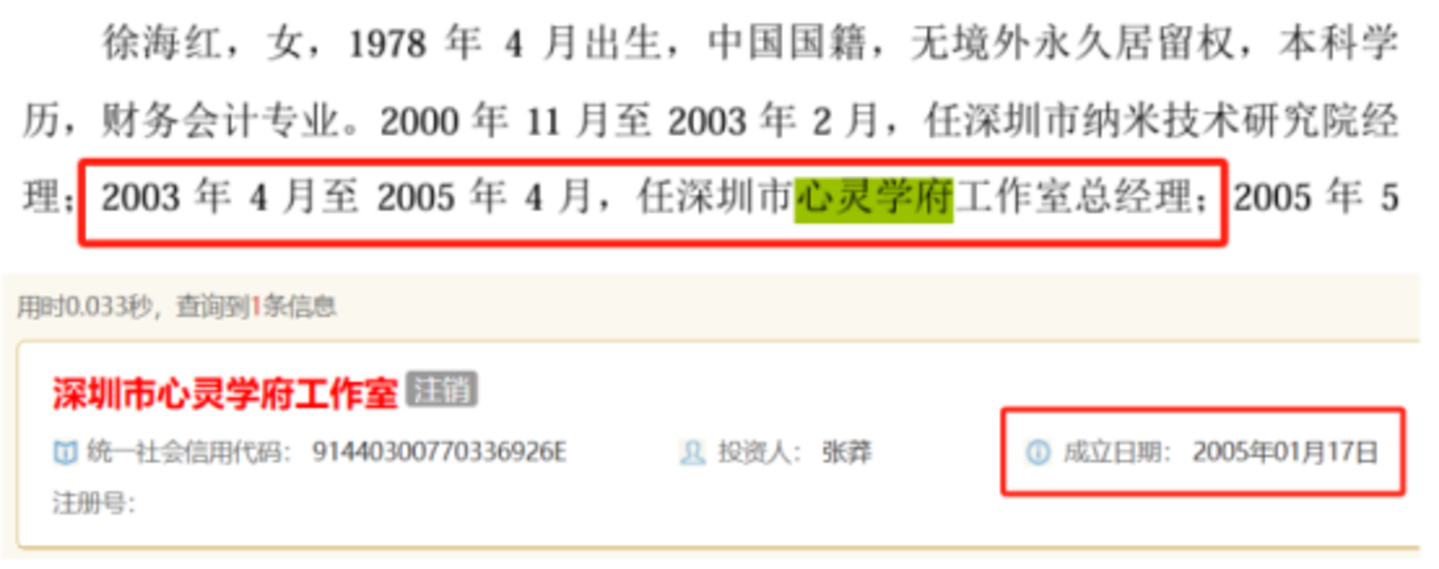 但不管是国家企业信用信息公示系统,还是天眼查和企查查均显示,深圳市心灵学府工作室的成立时间为2005年1月17日。那么在2005年1月17日前,徐海红是怎么担任总经理,有关“时空悖论”如何解?