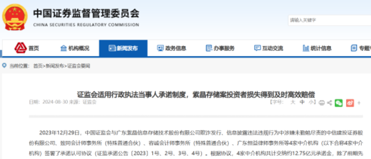另外,证监会8月30日公告显示,证监会终止对容诚所等4家中介机构调查。此前,证监会与紫晶存储欺诈发行、信息披露违法违规行为中涉嫌未勤勉尽责的容诚所等4家中介机构签署了承诺认可协议。根据协议,4家中介机构共计交纳约12.75亿元承诺金。