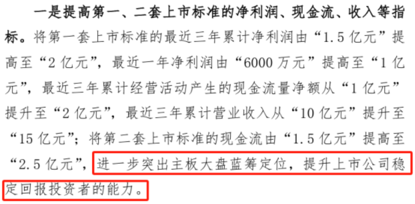 2024年4月12日,深交所将该标准修改为,“最近三年净利润均为正,且最近三年净利润累计不低于2亿元,最近一年净利润不低于1亿元,最近三年经营活动产生的现金流量净额累计不低于2亿元或者营业收入累计不低于15亿元。”。关于修改的原因,深交所在公告中表示,为进一步突出主板大盘蓝筹定位,提升上市公司稳定回报投资者的能力。