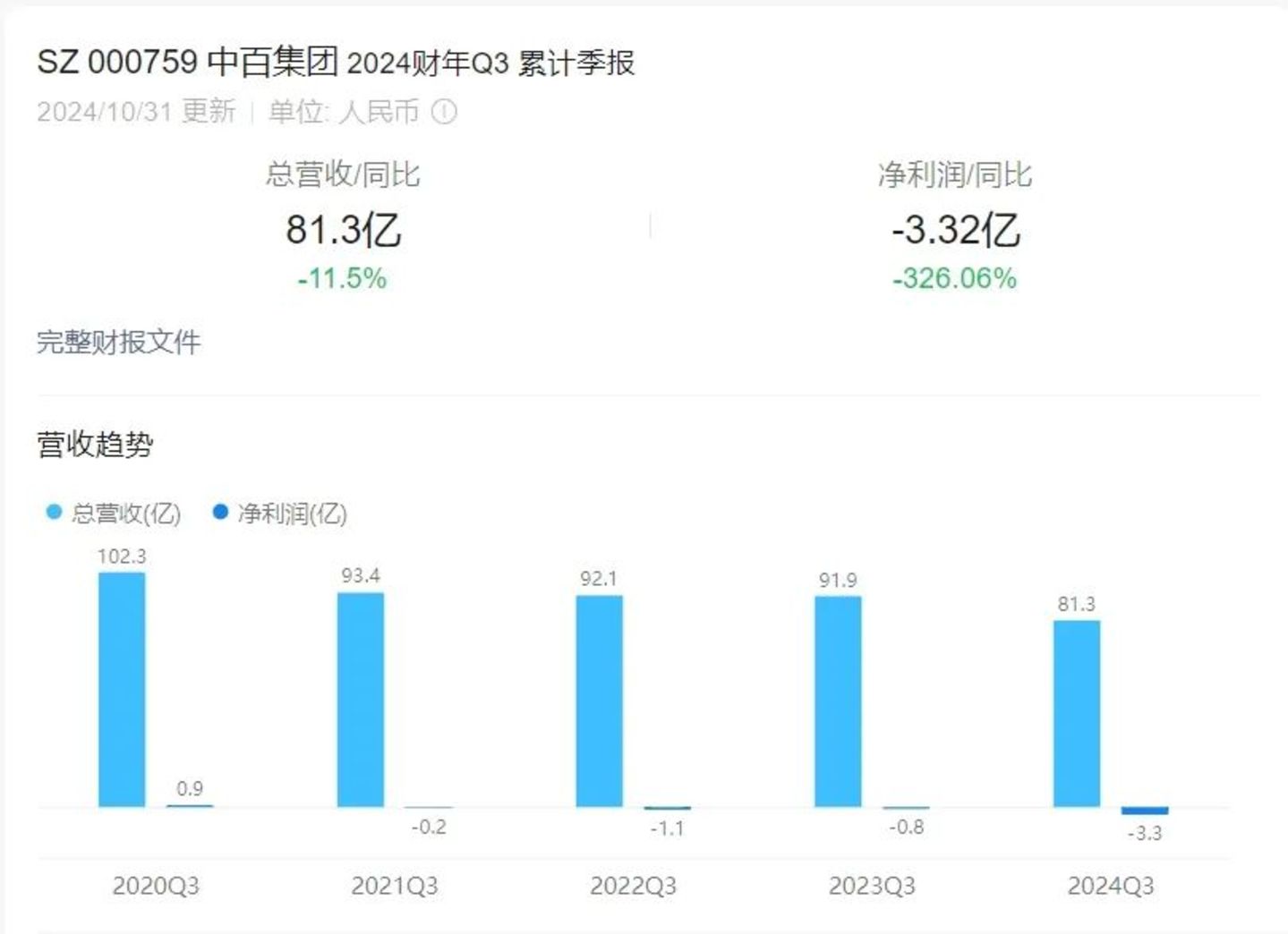 今年前三季度,中百集团实现营收81.3亿元,同比下降了11.50%,归属于上市公司股东的净利润亏损3.32亿元。
