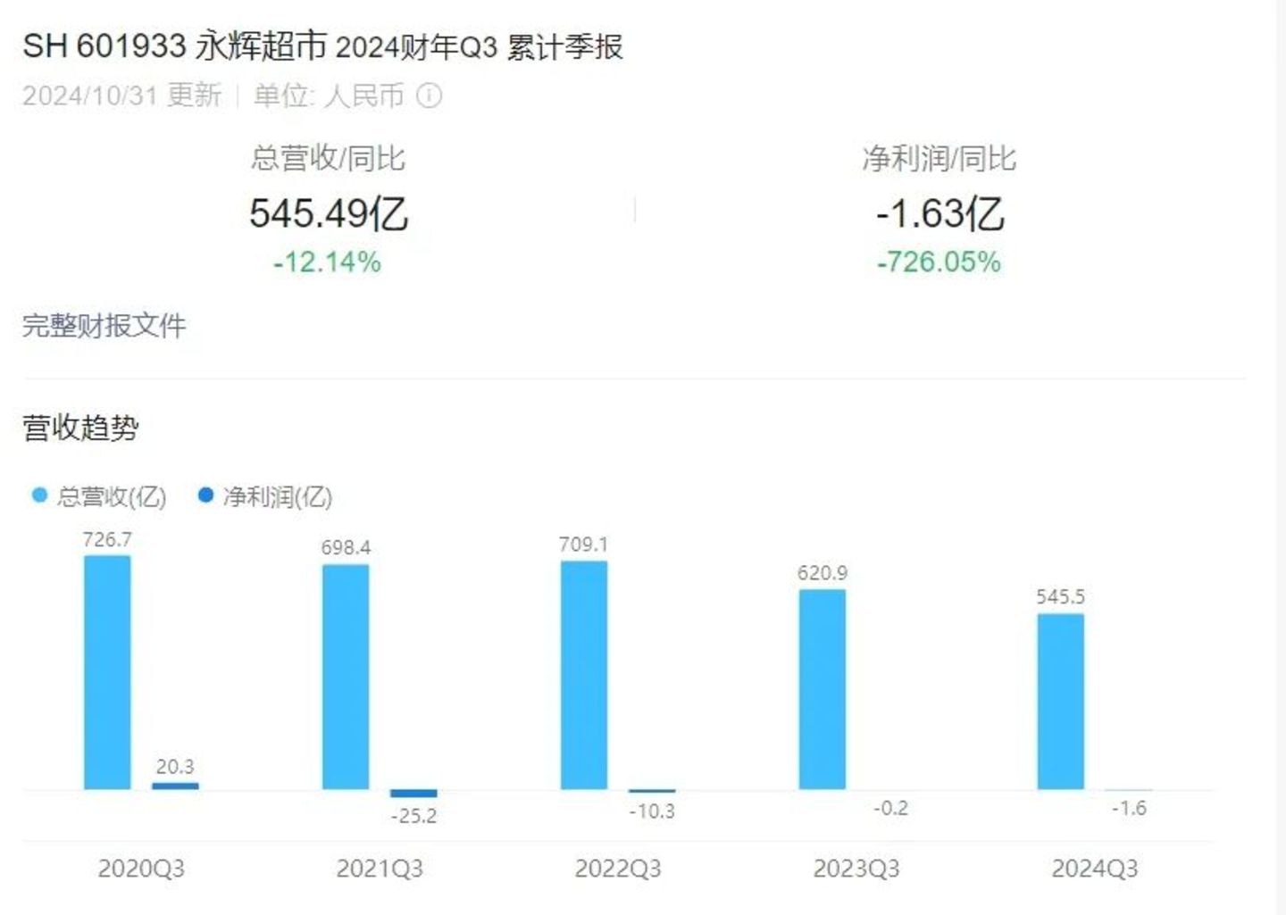 同样接受帮扶,并且有了名创优品大股东加入的永辉,在业绩上也并没有取得好成绩。