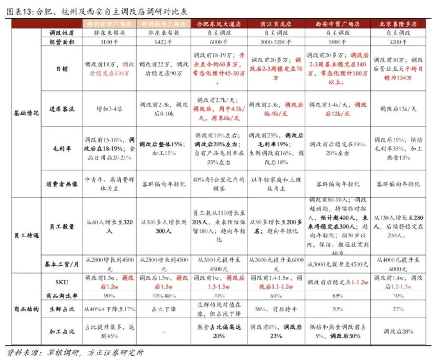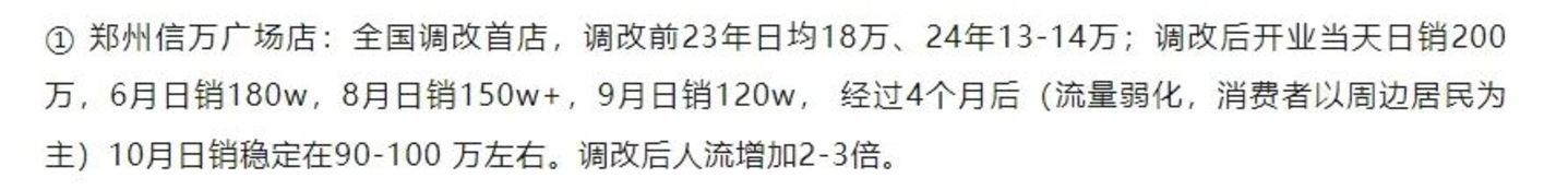 报告显示,以永辉全国调改首店,即郑州信万广场店为例,6月超市日销180w,8月日销150w+,9月日销120w,经过4个月后,10月日销稳定在90-100w左右。