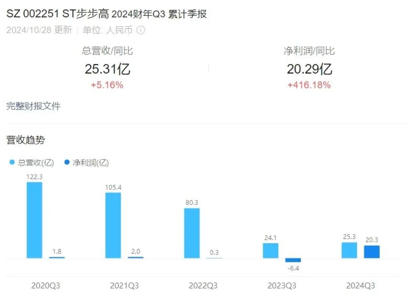 与上述两家商超的业绩表现有所不同,ST步步高在今年第三季度归属于上市公司股东的净利润达到20.97亿元,看上去形势大好。