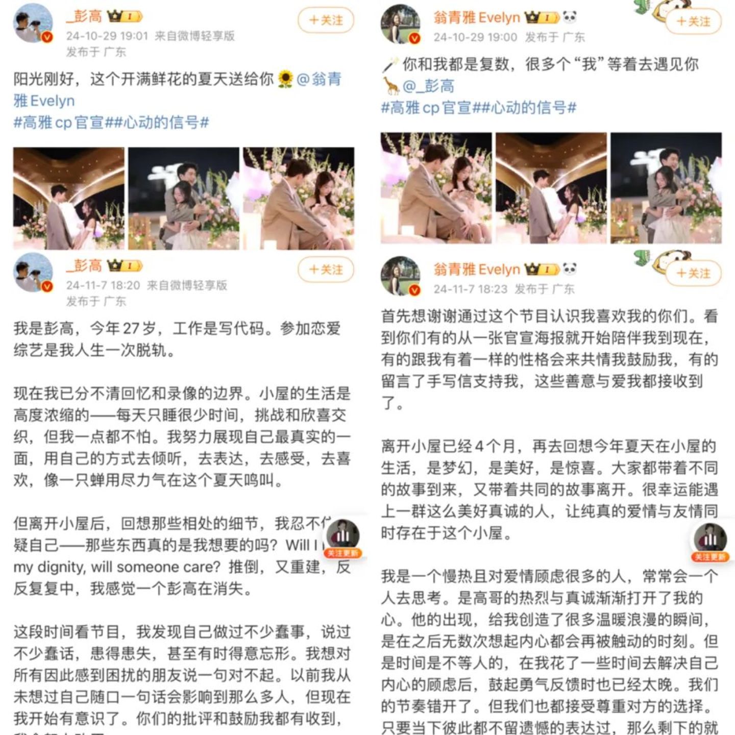 从观众的角度来说,也不难理解这种情绪的反扑,毕竟观众追随着节目中嘉宾们的情感动态,一步步深入,在最后时刻,突然急转直下,难免会有错落神伤的感觉。这种落差背后指向的是,恋综必然面对的桎梏——小屋内外其实是两个世界。