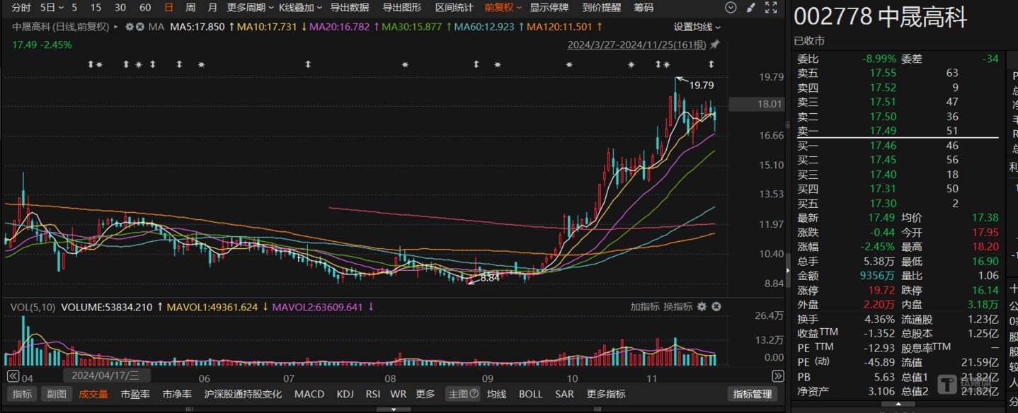 11月25日,中晟高科收盘报17.49元,跌2.45%。
