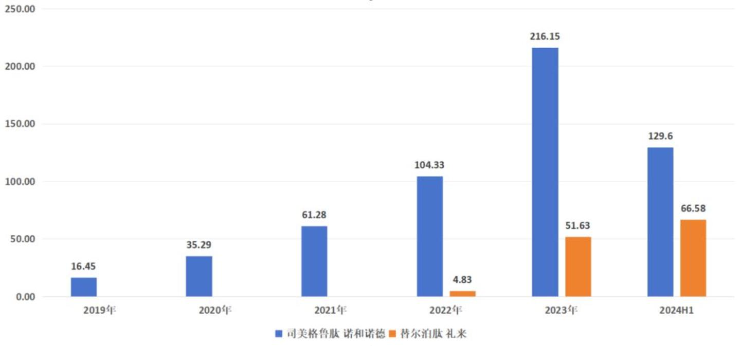 图:司美格鲁肽与替尔泊肽销售额(亿美元),来源:锦缎研究院