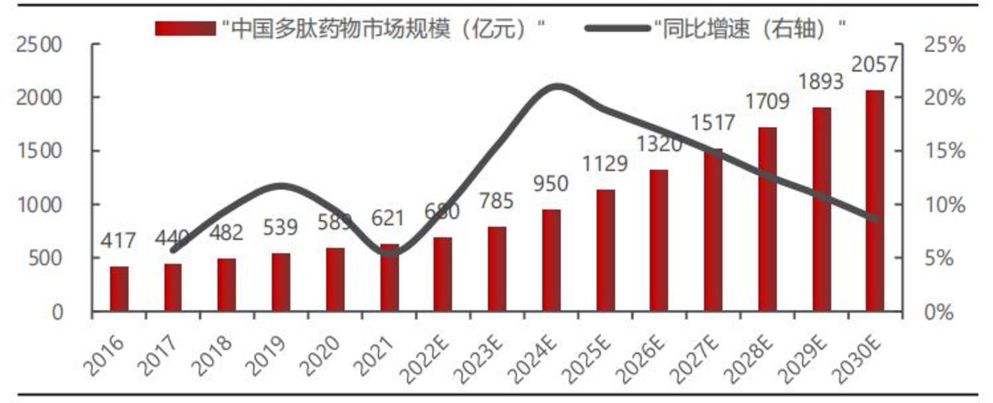 图:2016年-2030E中国多肽药物市场规模及增速(预测),来源:民生证券