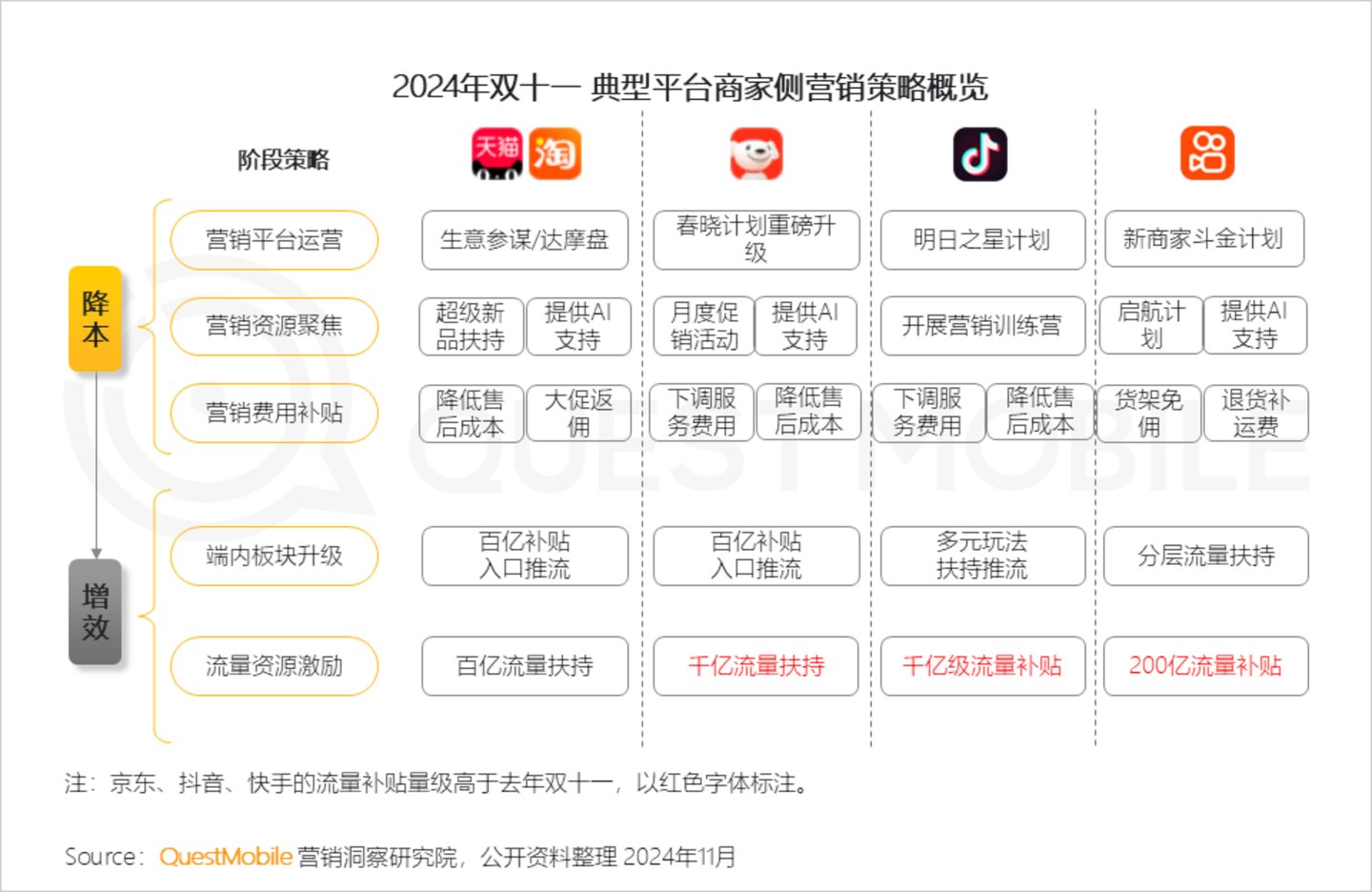 更广泛的应用在商家侧。电商平台基建的一部分就是为商家提供经营支持,但因为机制复杂,许多中小商家会将这部分经营工作外包给第三方代运营。AI 能做到的是将部分流程自动化,比如内容生成、物流优化、数据管理,降低门槛的同时降低成本。在 QuestMoblie 的双十一报告中也能看到,典型电商平台几乎都会在营销环节提供 AI 支持,以达到降本的目的。