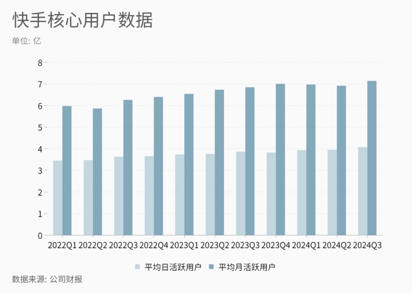 刚过去的 Q3 覆盖了巴黎奥运会,当下快手对体育 IP 的运营已经非常熟练,版权转播搭配自制内容和互动玩法,奥运会期间,快手上相关内容曝光量达到 3106 亿,有效拉动了一波流量。提高使用频次这方面,平台也对内容混排、流量分发等机制做了优化,三季度快手的日活跃用户日均使用时长为 132.2 分钟,用户总使用时长同比增长 7.3%。