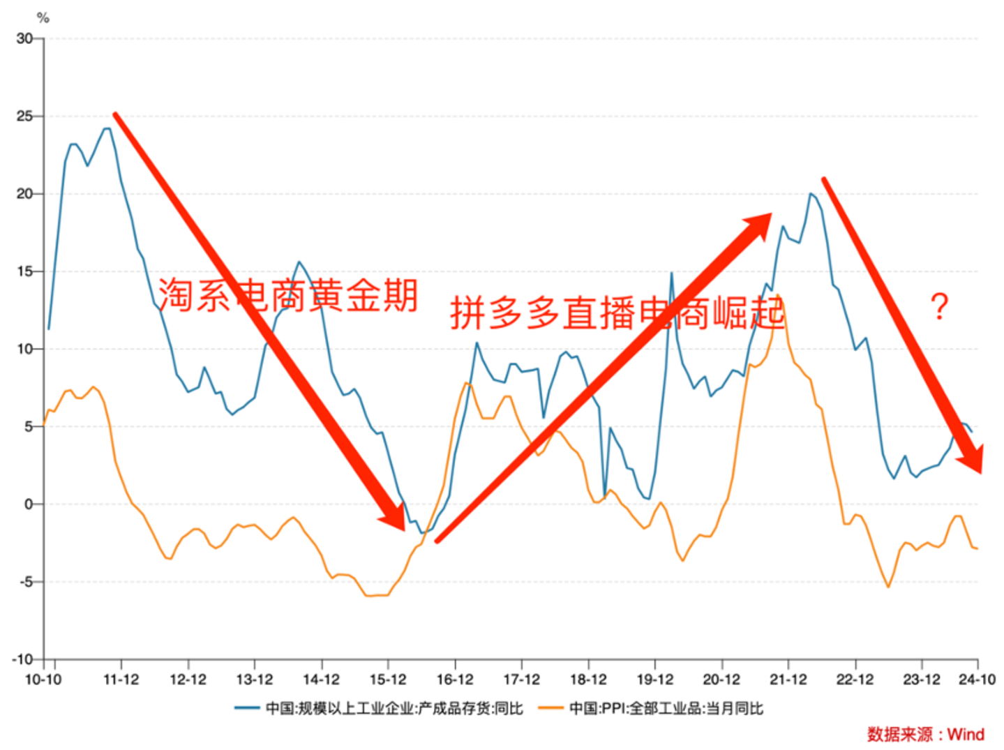 当我们将宏观经济指标与行业发展结合观察,会发现惊人的相关性。淘系电商最辉煌时期,乃是上一轮的去库存周期,中小卖家和品牌商家通过线上化改革实现销售增量,在其后新的产业周期内,拼多多抓住“货找人”窗口期快速崛起。