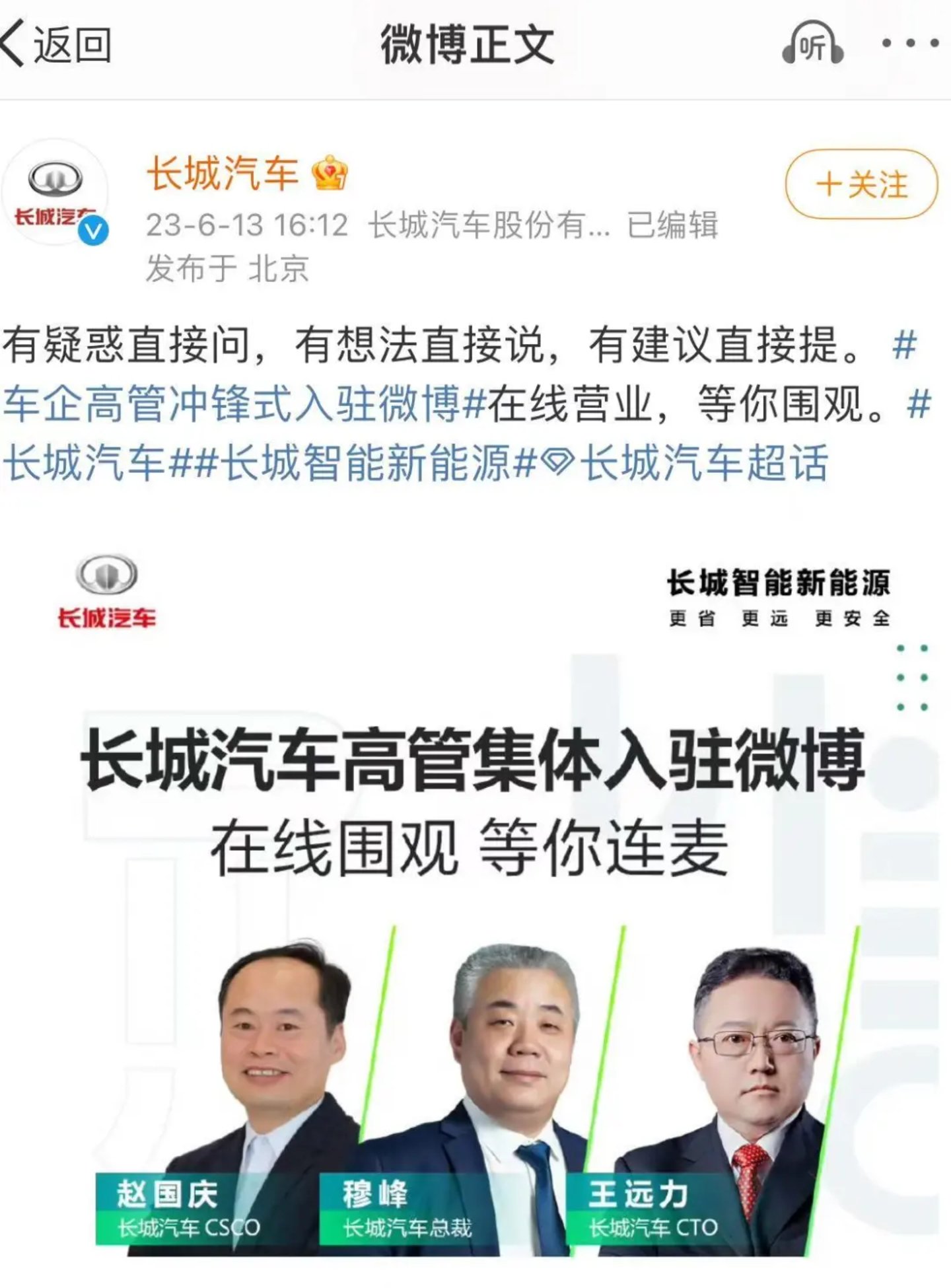 去年6月,长城18位高管集体官宣入驻微博,涵盖长城汽车旗下的五大品牌,如坦克、哈弗、欧拉沙龙等。当时,长城汽车微博发布的文案是“有疑惑直接问,有想法直接说,有建议直接提。”显然,品牌声量的构建只是第一步,注意力的争夺之后,平台也在车企和受众之间建立起了直接的沟通机制。