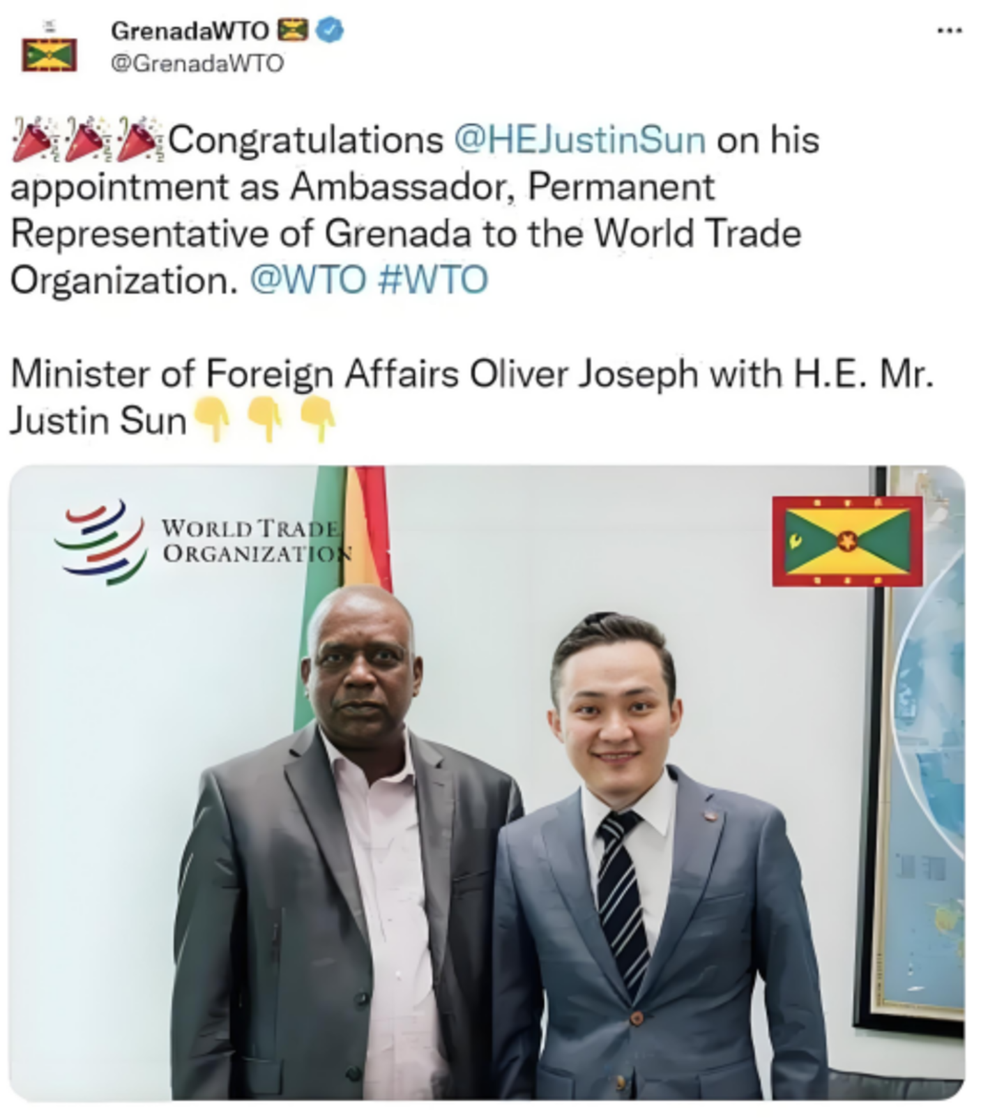 之后,孙宇晨的路仿佛越走越宽,2022年摇身一变成了南美洲岛国格林纳达的公民,更成为这个国家的驻WTO大使。