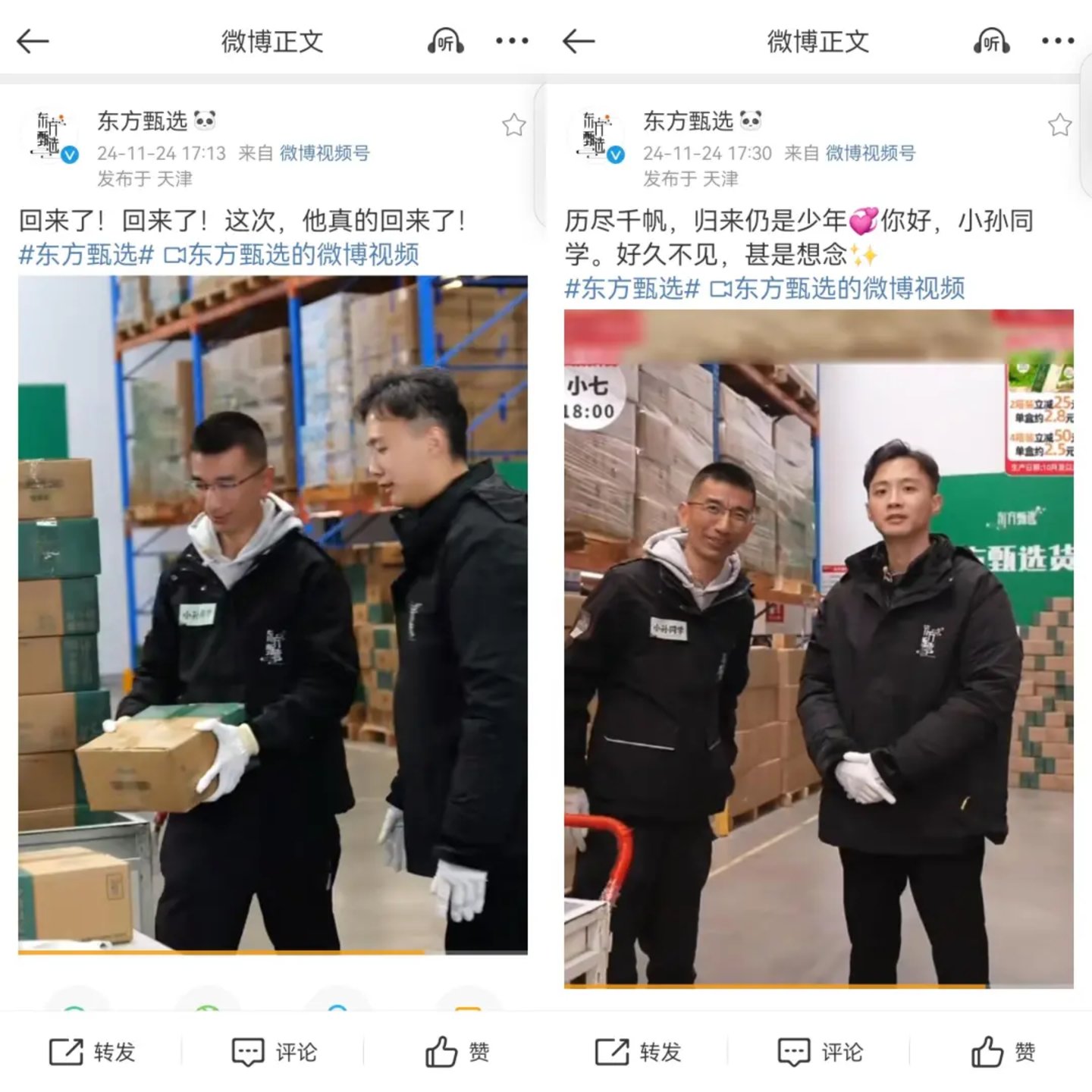此时的孙东旭虽然恢复了社交平台的更新,但展示的更多是“幕后工作”,直到11月23日,东方甄选的主账号发布了一条视频,东方甄选旗下的yoyo、明明和天权等当家主播激动地讨论“那个男人要回来了”。