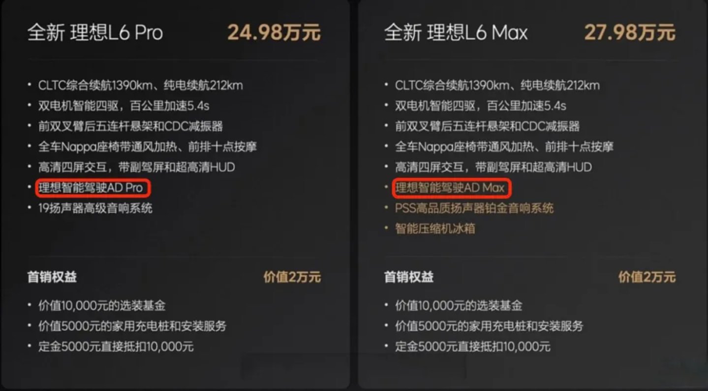 理想虽然没有单独将高阶智驾拆出来“卖”,但以理想L6为例,理想L6的Pro版本和Max版本的差价在3万元,而这两个版本的主要区别就在于智能驾驶系统的不同配置,后者提供了更高级别的智能驾驶功能。