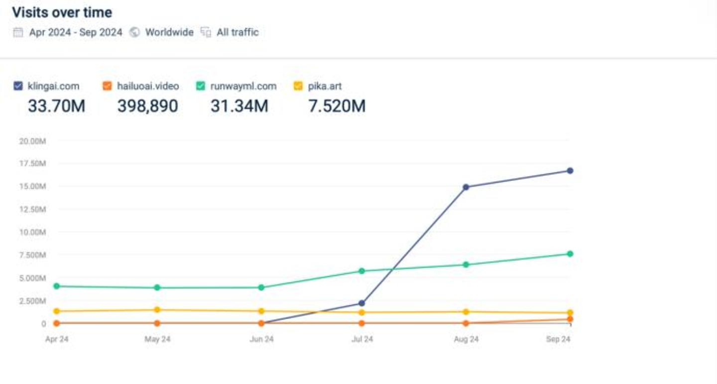 据国外网站分析工具Similarweb显示,在同期AI视频产品中,可灵流量增长十分迅速。截至9月24日,可灵的总访问量达到了3370万,高于早已发布产品的Runway(3134万)和Pika(752万)。