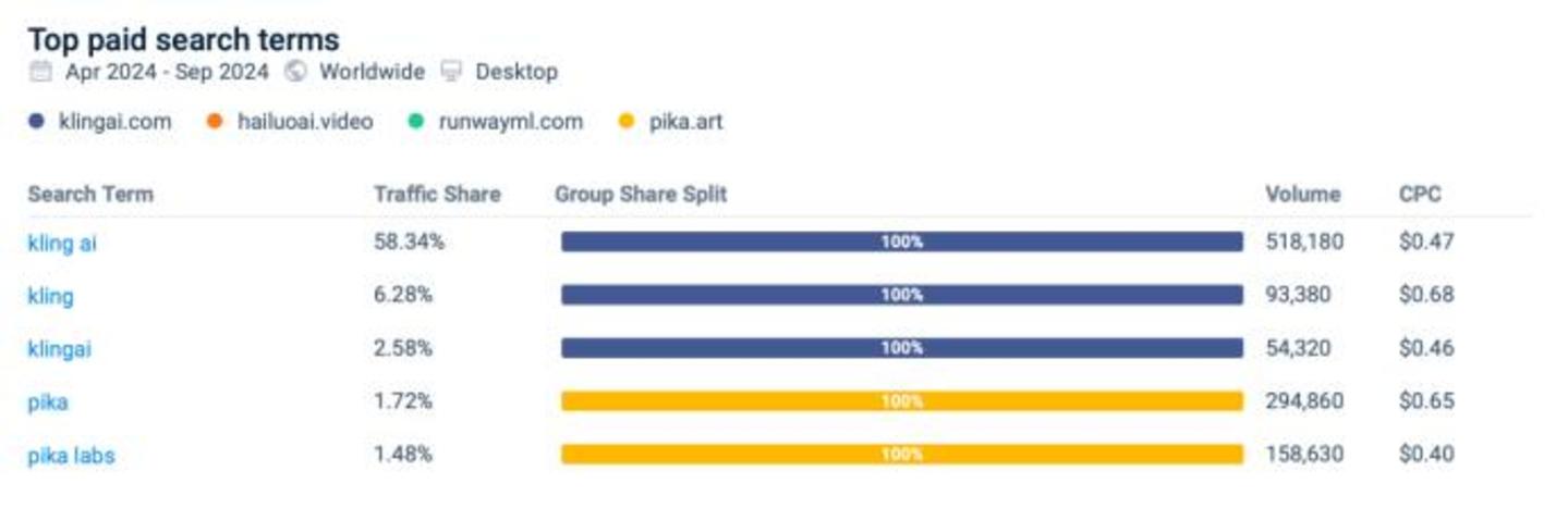 从6月24日到9月24日,快手以“King ai”“King”“Kingai”为关键词在海外进行了大规模投流,其付费搜索支付的CPC(每次点击费用)已经达到了该赛道头部水平。按Similarweb估算,三个月期间,可灵海外投放费用约在33.2万美元,折合人民币约232.4万元。而同期创业公司Pika只有其九分之一,总投放费用仅有25.5万美元。