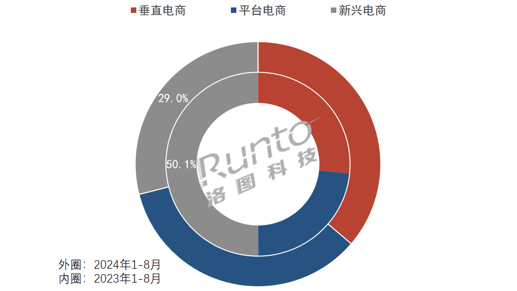 RUNTO数据显示,2024年1-8月,新兴电商(拼多多、抖音、快手等)的销量占比为29.0%,较去年同期下降了21.1个百分点,销量较去年同期仅小幅增长7.4%。而垂直电商(京东、苏宁易购等)和平台电商(淘天)的占比则实现了大幅增长,各自分割到约10个百分点,销量涨幅也都超过了150%。