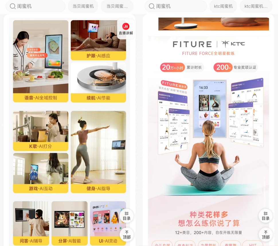 在KTC的商品详情中,就有提到其闺蜜机内置的健身功能便是与健身镜品牌FITURE合作的。