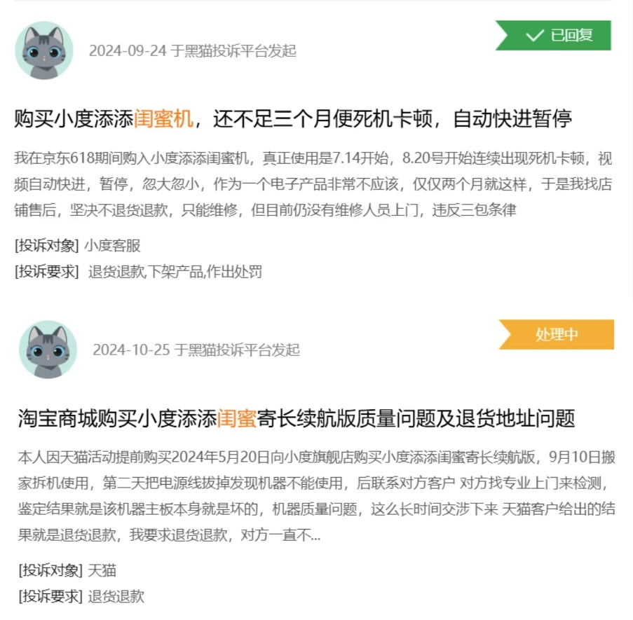 黑猫投诉显示,截至发稿,关于闺蜜机的投诉为100余条,其中接近三成的投诉对象都是小度添添闺蜜机,除了价保问题外,其他多为卡顿、故障等质量问题。
