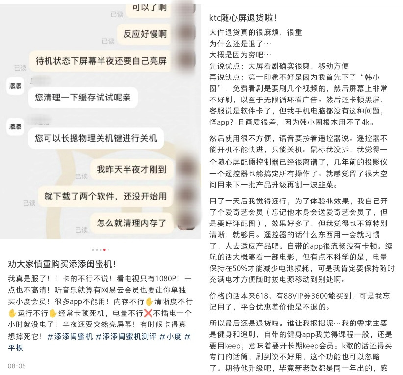 PConline在小红书搜索也发现,画质差、卡顿、内存不足、续航不足、音效差、遥控器和语音控制不智能……正在成为闺蜜机避雷“重灾区”。