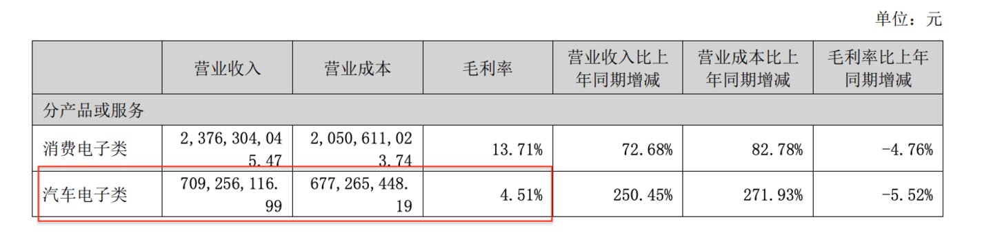 此种背景下,光弘科技的汽车电子业务已从高毛利率业务转变为一笔薄利多销的生意,反应在业绩上,是汽车电子业务收入突飞猛进和毛利率的持续走低。