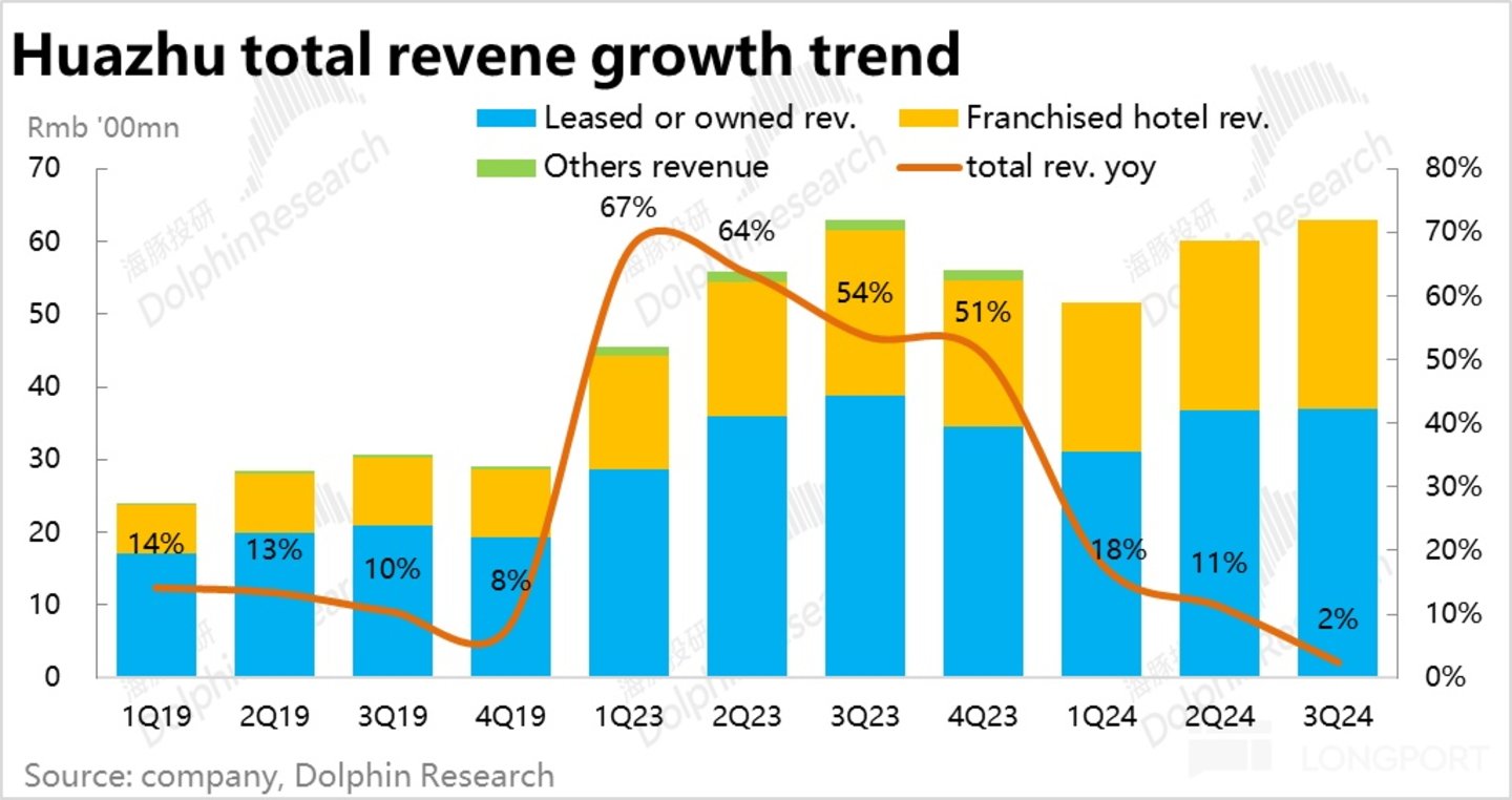 由于 RevPAR、ADR、入住率同比全线的走低,本季度华住整体营业的增速继续放缓到了仅 2%,位于公司先前指引 2%~5% 区间的底部,也低于市场预期 4.6% 的增速。