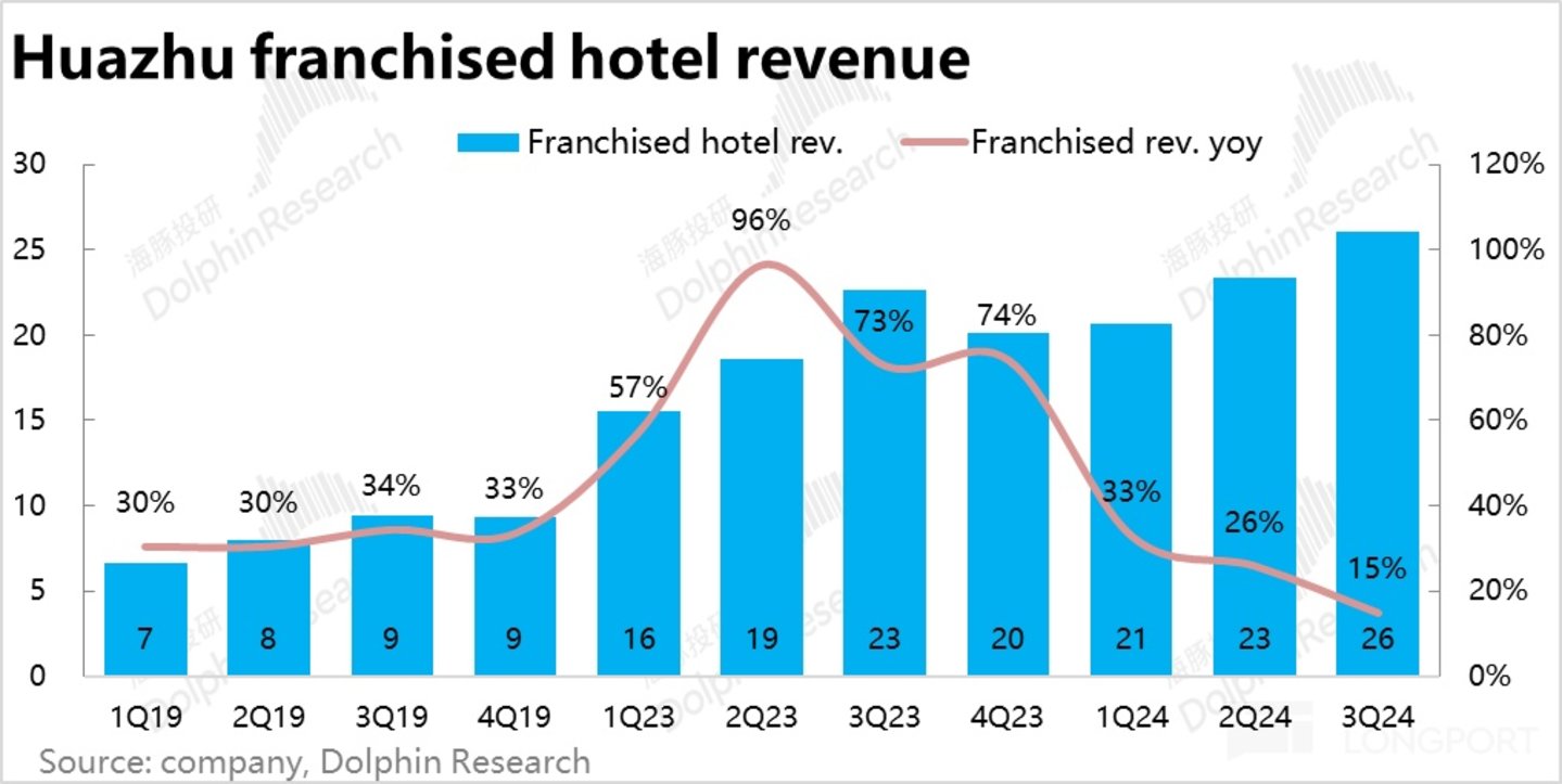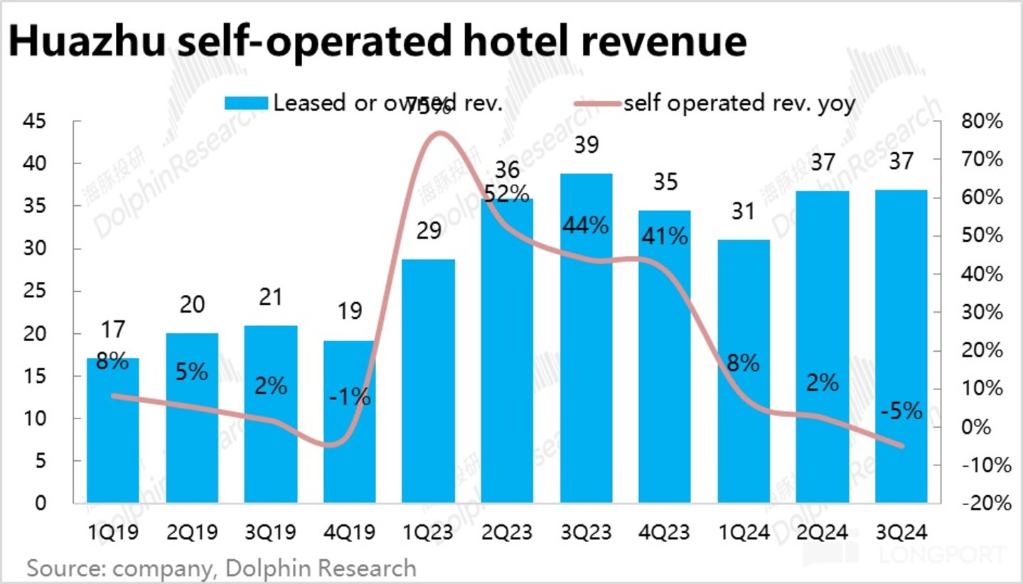 3、本季度华住整体营业的增速继续放缓到了仅 2%,位于公司先前指引 2%~5% 区间的底部,也低于市场预期 4.6% 的增速。乍看很差,但其中有自营业务在营收口径内被过分夸大的影响。华住直营业务,因创历史新高的净关店,已陷入 5% 的收入同比萎缩。加盟业务在历史新高开店数量的推动下,营收同比仍增长 15%(虽较上季也是明显防放缓的)。
