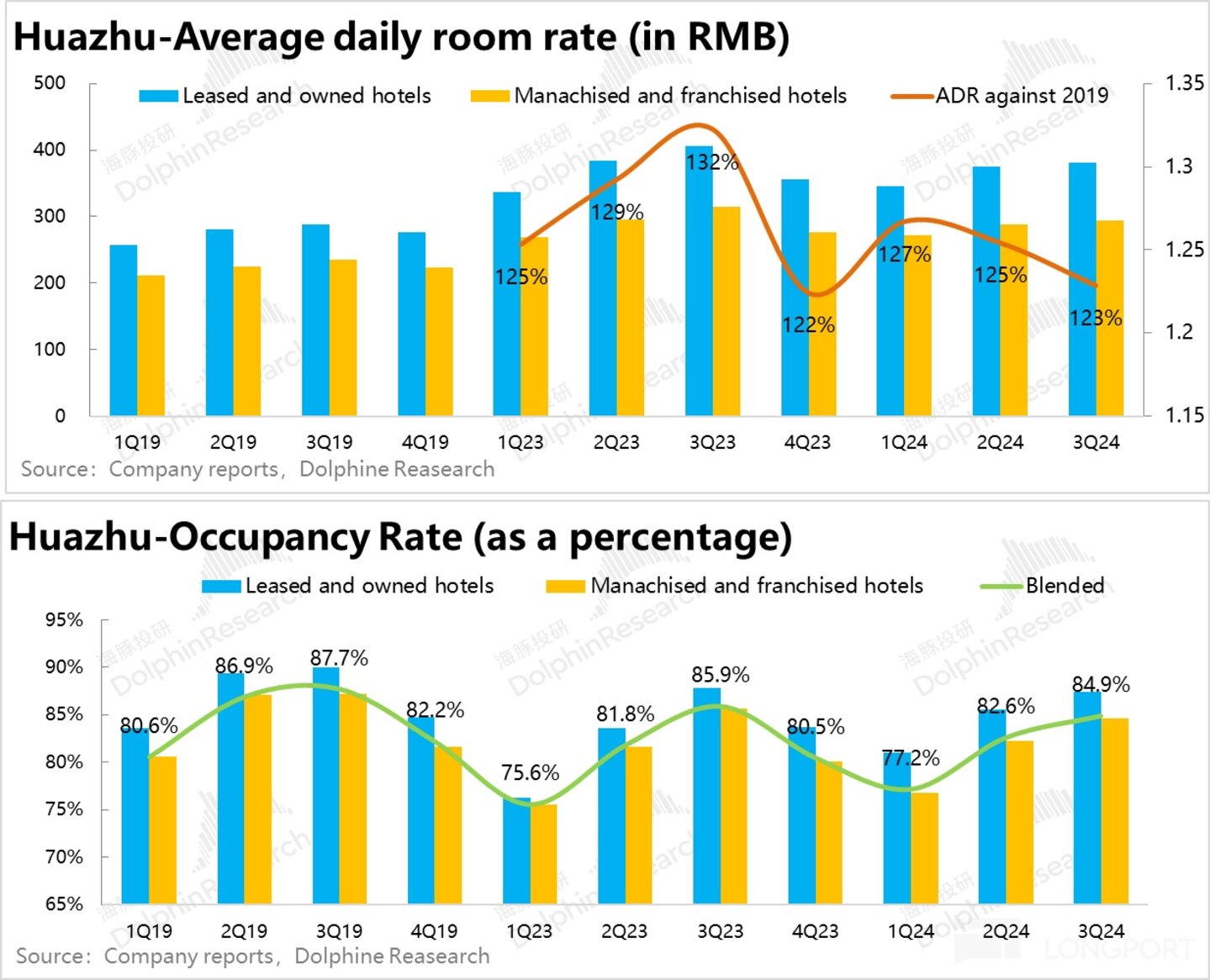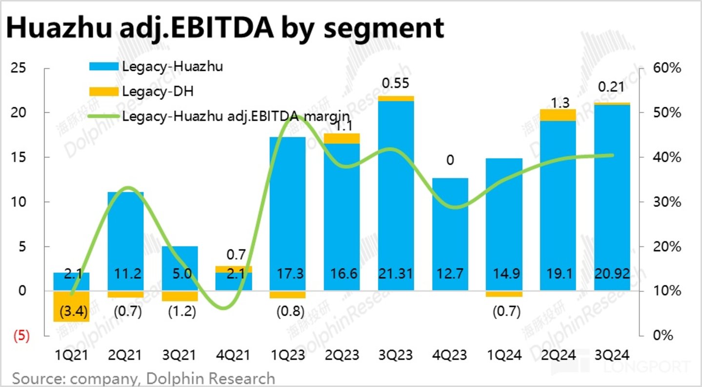 因此,华住整体调整后 EBITDA 为 21 亿,相比去年同期的约 23 亿,不增反降,也低于卖方预期的 23 亿。分部来看,无论是华住国内还是海外 DH、虽然收入体量都有所增长,但利润都是同比走低的。