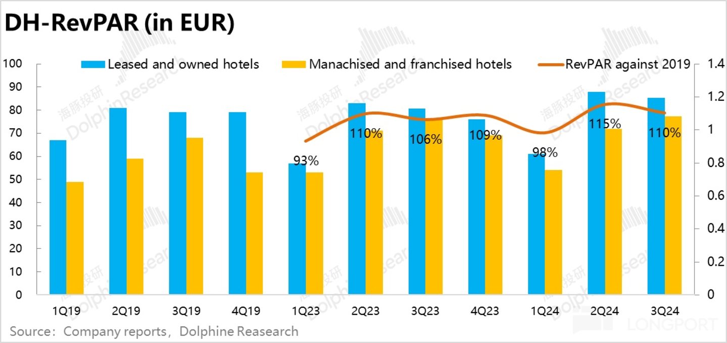 欧洲的酒旅在巴黎奥运会的带动效应下,保持着相对高的景气度。平均单间收入(RevPAR)仍达 19 年同期水平的 110%。不过海外业务的体量过小,对集团整体并无多大影响。另外, 之前两个季度由于欧洲杯和奥运会导致的 “高峰期” 能否持续也有待观察。