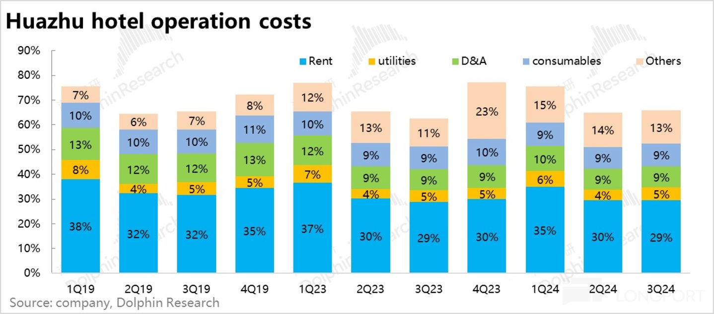 4、毛利层面,成本项同样相对更受自营业务的影响,也相对缺乏弹性。本季华住总酒店运营成本约 38 亿,环比上季的 37.3 亿仅略有增长。毛利环增程度和收入基本一致。