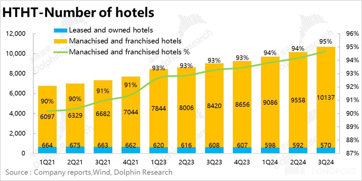 但结构上,华住的自营门店关店节奏是在提速的,本季度净关店了 32 家,据我们了解是历史上单季净关店最多的。对应的,加盟门店的开店速度也再创历史新高,华住越发的平台化和轻资产化。