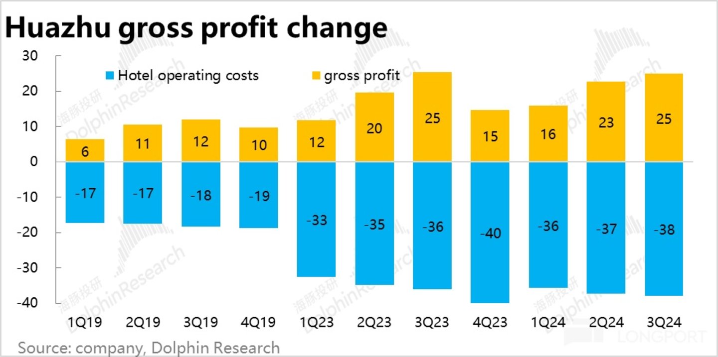 毛利层面,由于加盟业务是以净收入计入财报,因此财报中的成本项同样相对更受自营业务的影响,也相对缺乏弹性。由下图可见,本季华住总酒店运营成本约 38 亿,环比上季的 37.3 亿仅略有增长。由于收入环增近 2 亿,毛利润额也环比增长约 2 亿,从这个角度看,还算不错。