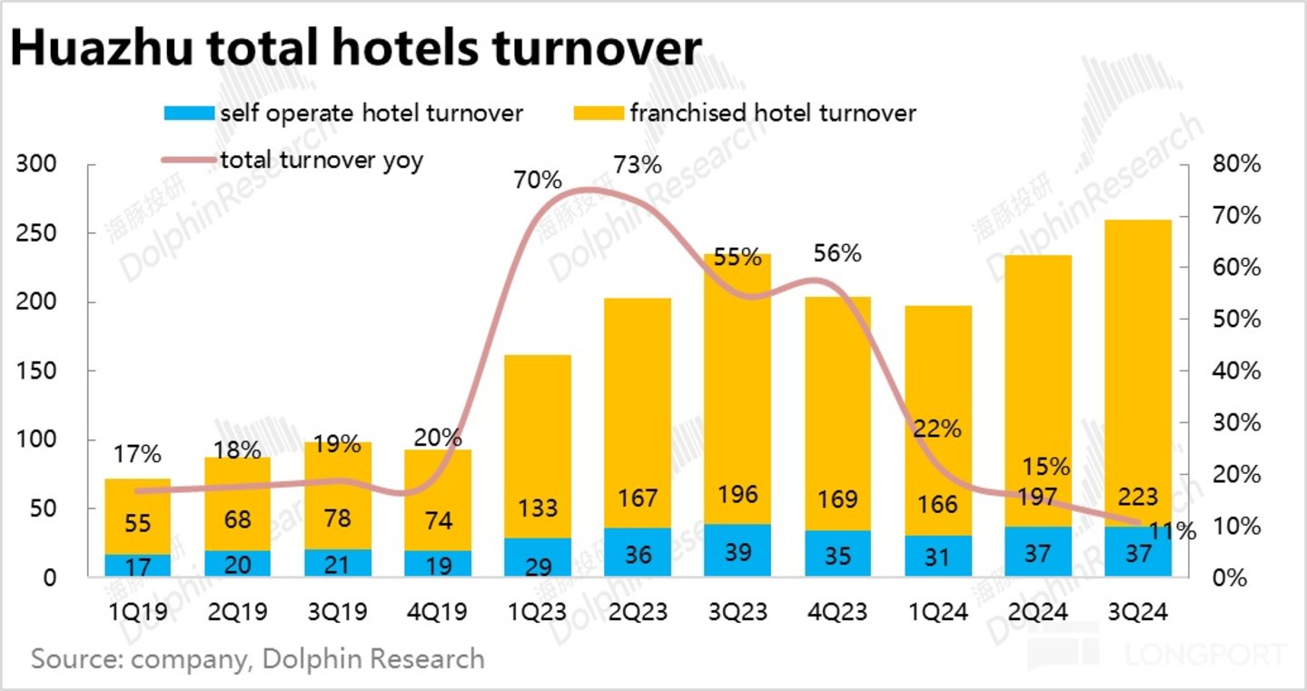结合来看,快速增长的门店数量对冲了 RevPAR 的同比下滑,华住集团本季全部酒店的流水额同比增长了 11%,比上季度的 15% 进一步放缓。相比营收因自营和加盟业务确认口径的不同,不合理的放大了自营业务的重要性,流水指标更准确的反映了真实经营状况的。