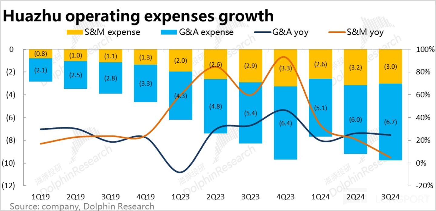 5、 在收入增长仅 2%+,毛利润额更是同比略降的前提下,本季华住的销售费用同比增加了约 5%,管理费用更是增长了 26%,主要还是员工数增长和股权激励增长的影响。在创收能力趋缓的情况下,费用却高速增长。