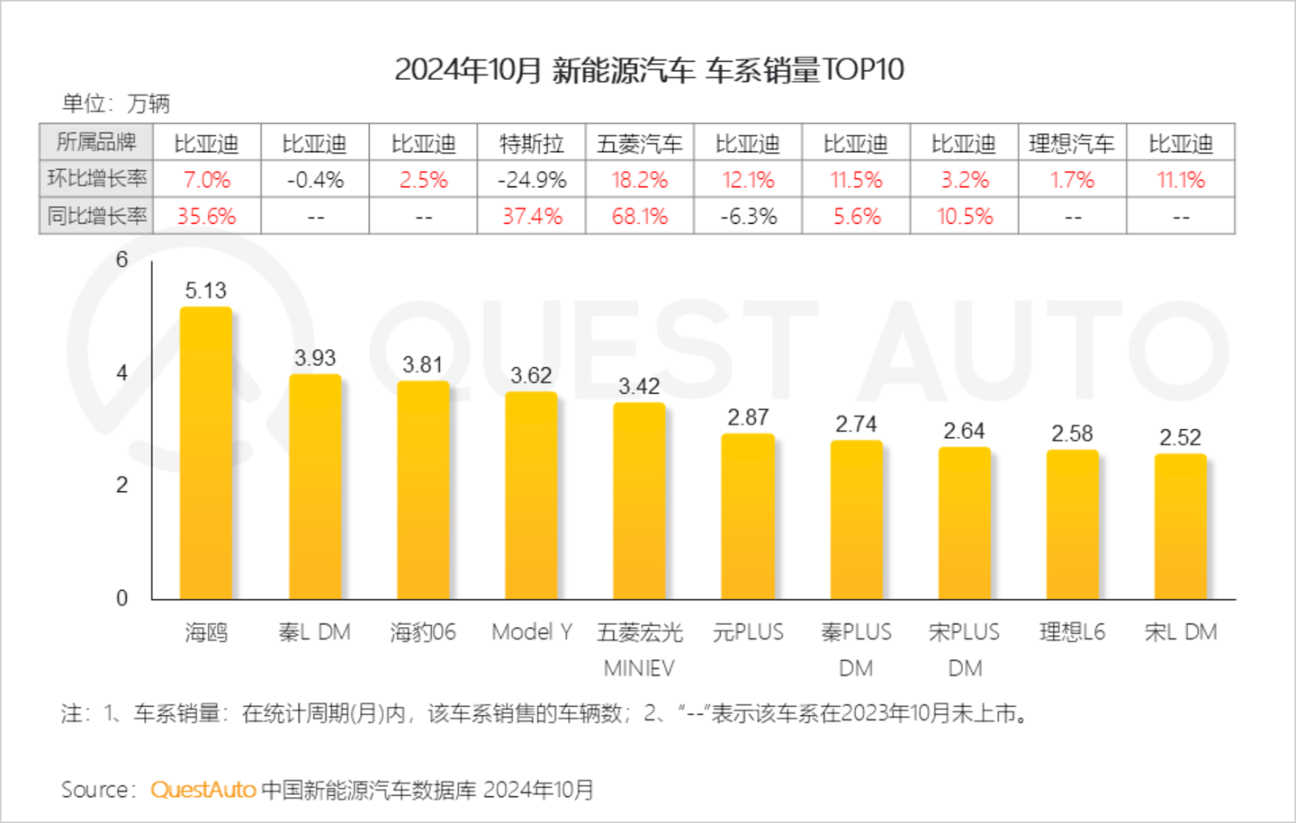 3、比亚迪海鸥月销量突破5万辆,秦L DM、海豹06、Model Y及五菱宏光MINIEV的10月销量也超过3万辆