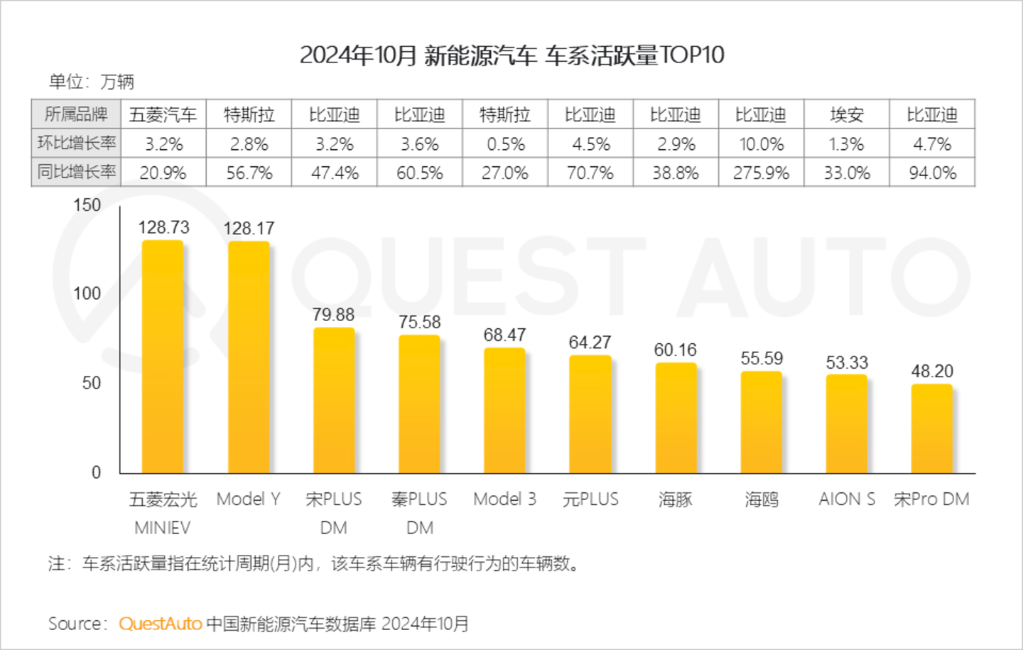 4、五菱宏光MINIEV与特斯拉Model Y的活跃量均达到128万辆,比亚迪宋PLUS DM与秦PLUS DM占据三、四位,活跃量均超过75万辆
