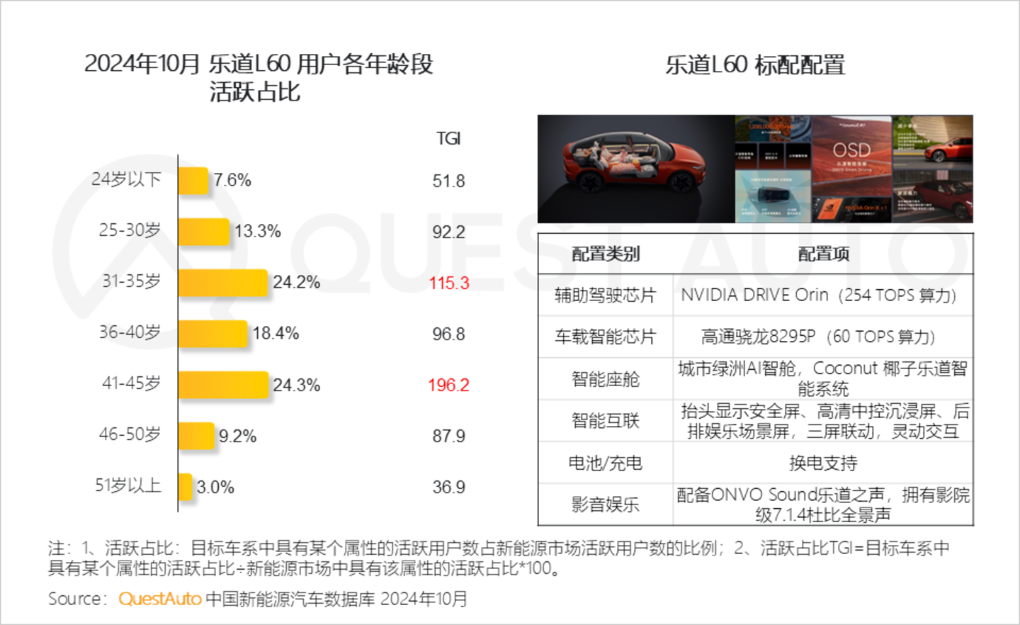 4、蔚来全新子品牌乐道汽车正式发布首款车型乐道L60,新车定位主流家庭市场,深入洞察家庭用车需求,31-45岁购车用户占比接近七成