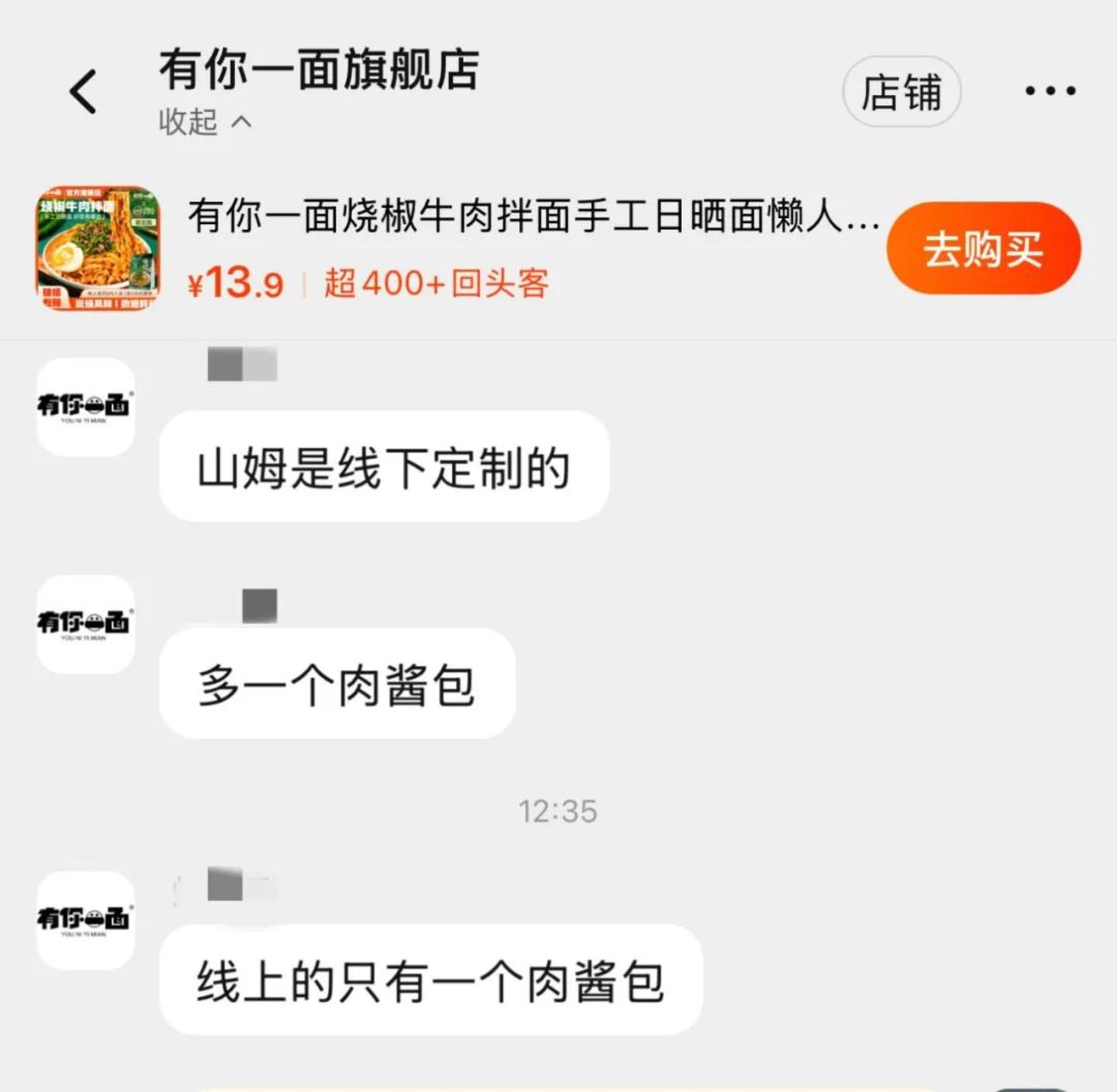这么做的结果是,即使同样是新晋速食面品牌“有你一面”的爆款产品烧焦牛肉拌面,在山姆和在其他渠道也有两幅面孔。同款产品,“有你一面”天猫官旗店售价是13.9元/袋,规格是90g面饼搭配92g的的料包,山姆的版本则是59.9元/6袋,每袋的规格为90g面饼搭配122g的料包。“有你一面”官旗店的客服告诉我们,山姆提供的产品是专门“线下定制的”,比普通的线上款多出了一个肉酱包。