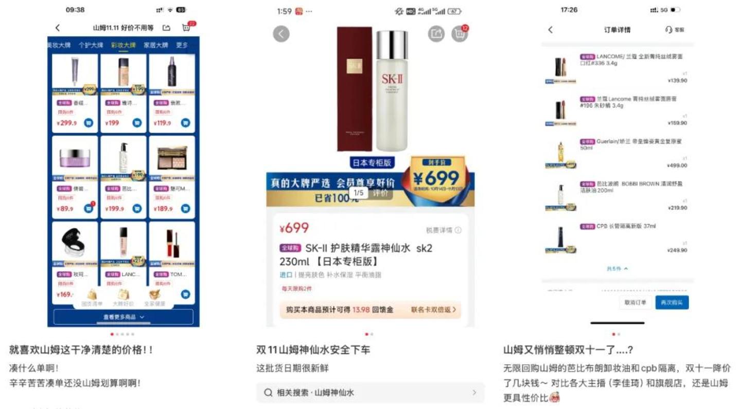 有沪漂说她除了给自己买,也乐此不疲给县城老家的父母和亲戚买山姆,因为它的东西别的地方买不到,会让她觉得有面子。一对每周都逛山姆的老年夫妻表示,他们最开始也不理解儿子为什么要办那么贵的会员卡,直到发现用山姆的排骨炖出来的汤总会比别家卖的骨头香。而在今年双11,网上有不少省钱攻略显示,山姆全球购的美妆产品,比很多电商平台百亿补贴或者头部主播给出的价格都优惠,而且还是没有任何花里胡哨赠品的裸价优惠。