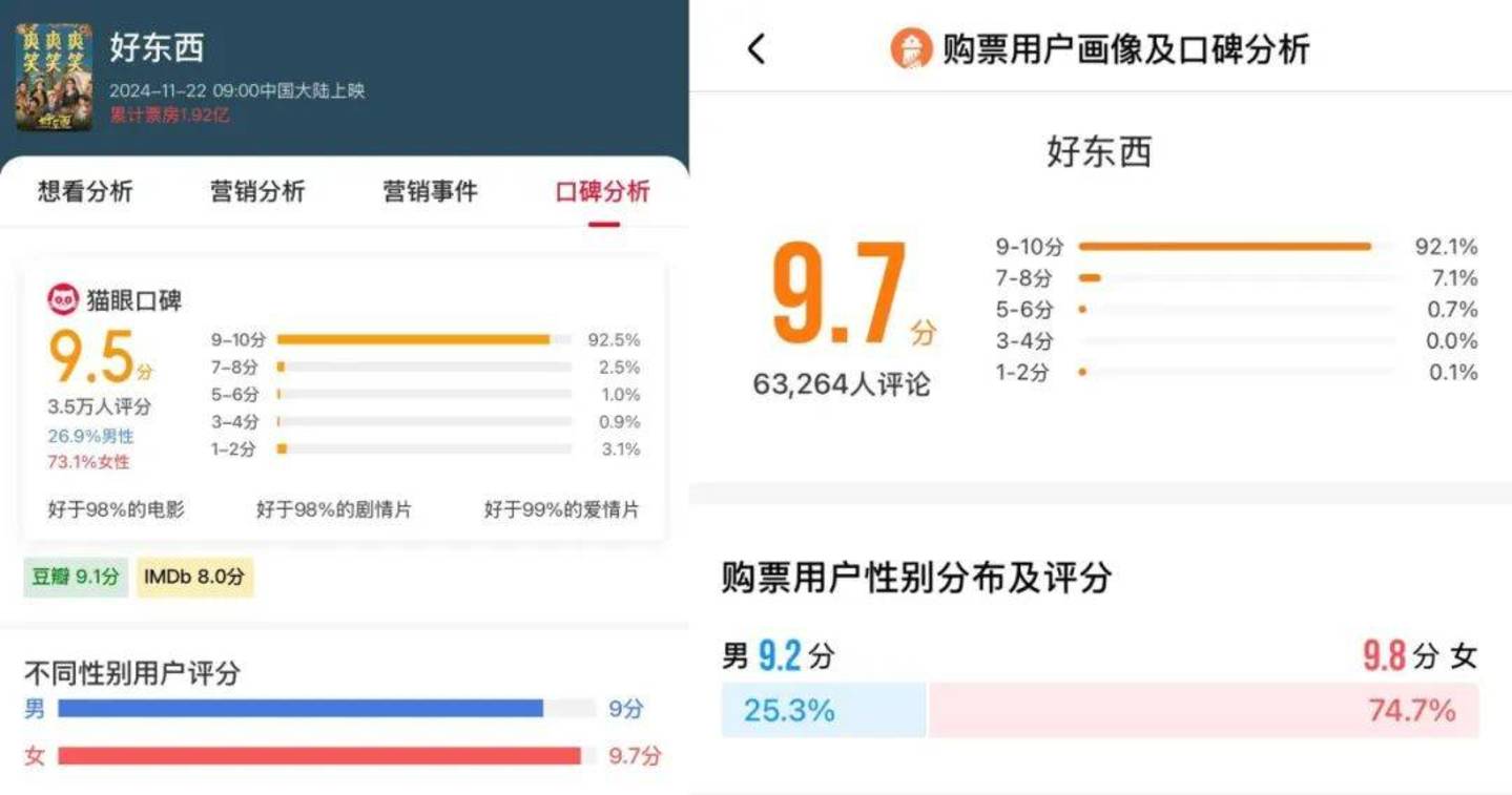 在猫淘平台上,男性观众给出的评分更分别达到了9分和9.2分。这足以验证,《好东西》是一部有关性别却又无关性别的好作品。