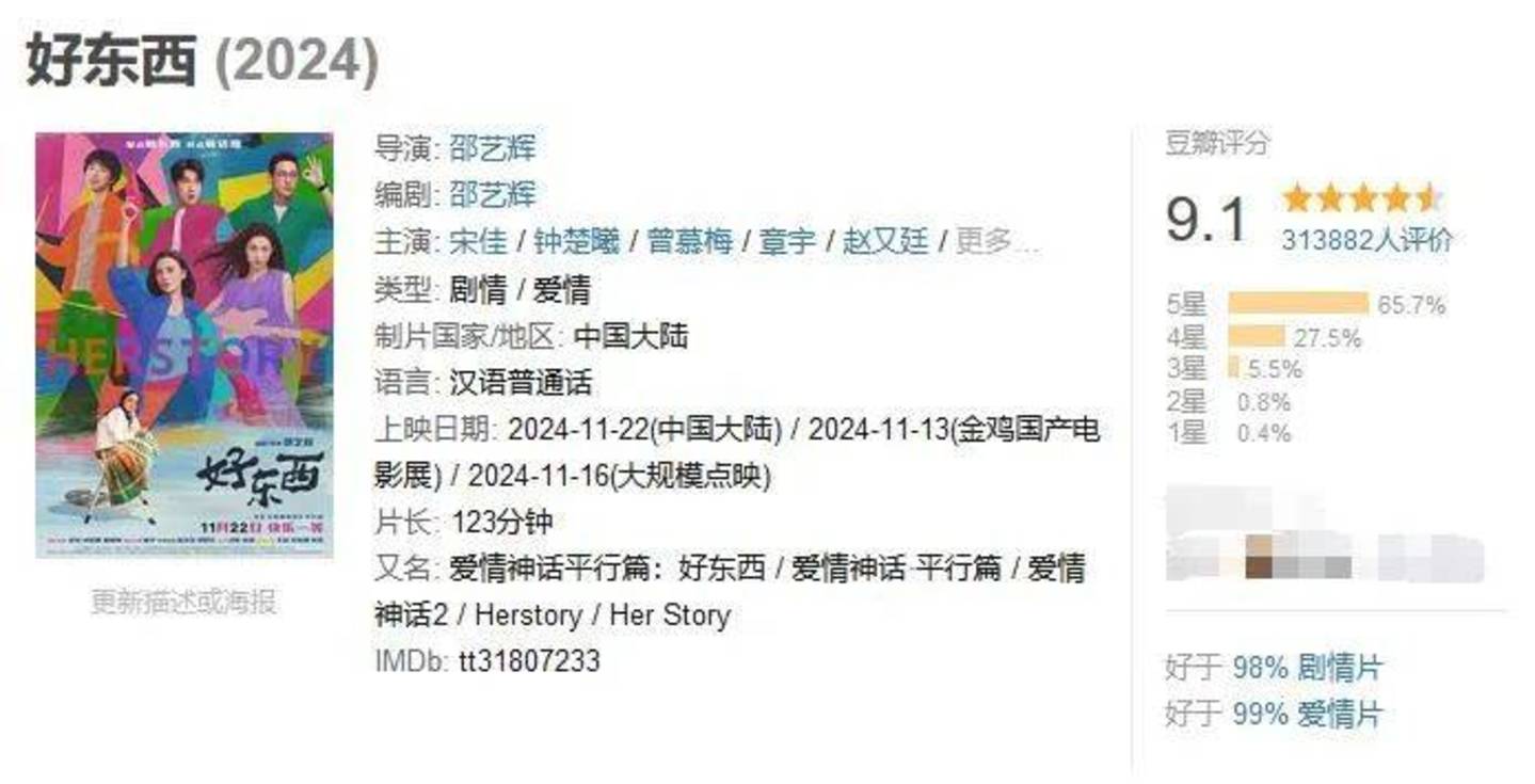 豆瓣9.1,上映五天累计票房1.9亿,稳超《爱情神话》票房,预测票房连涨3天有望达到5亿+量级,这都是属于正在热映的《好东西》的殊荣。