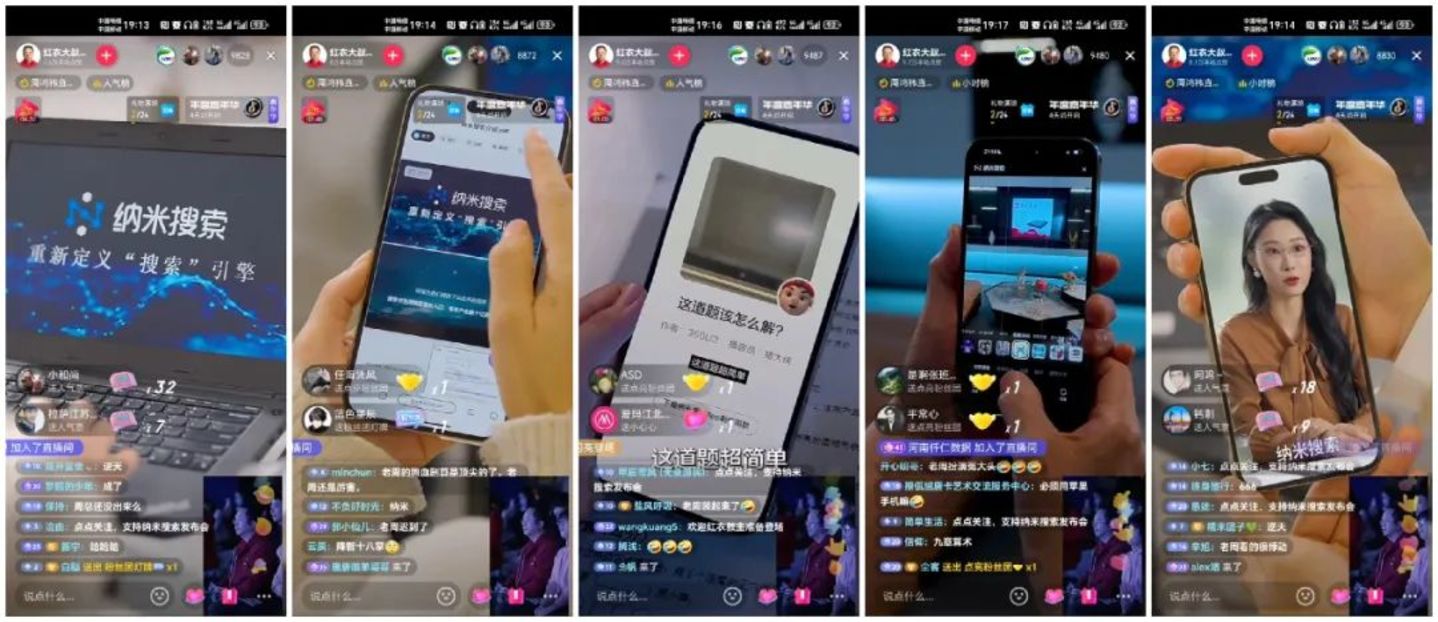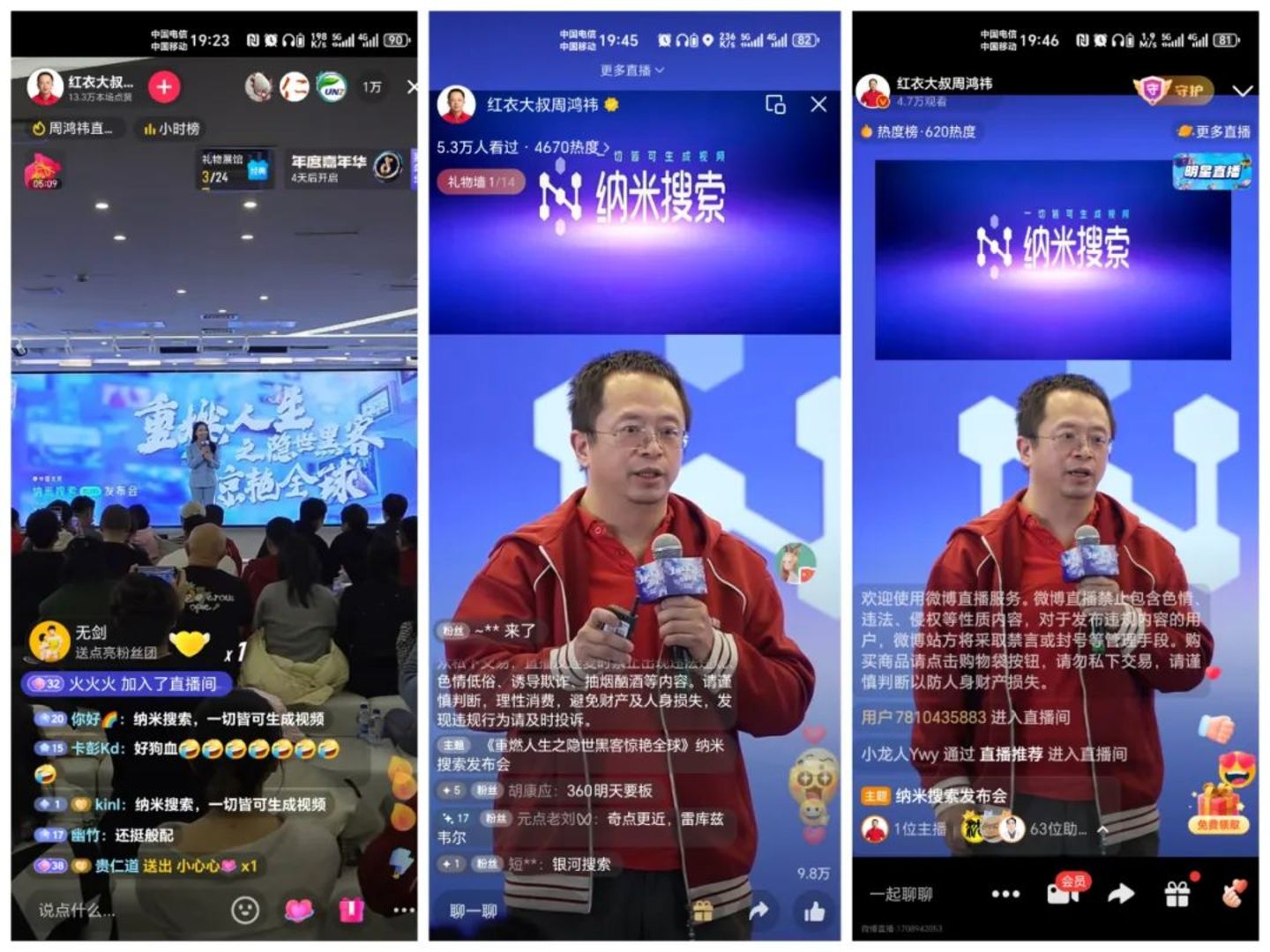 从发布会在线观看人数来看,“红衣大叔周鸿祎”的抖音号直播间在线人数半小时内人数超1W。另外,微信视频号直播在线观看人数超5W人次,微博直播间观看人数也近5W人次,总计超10W人在线观看。