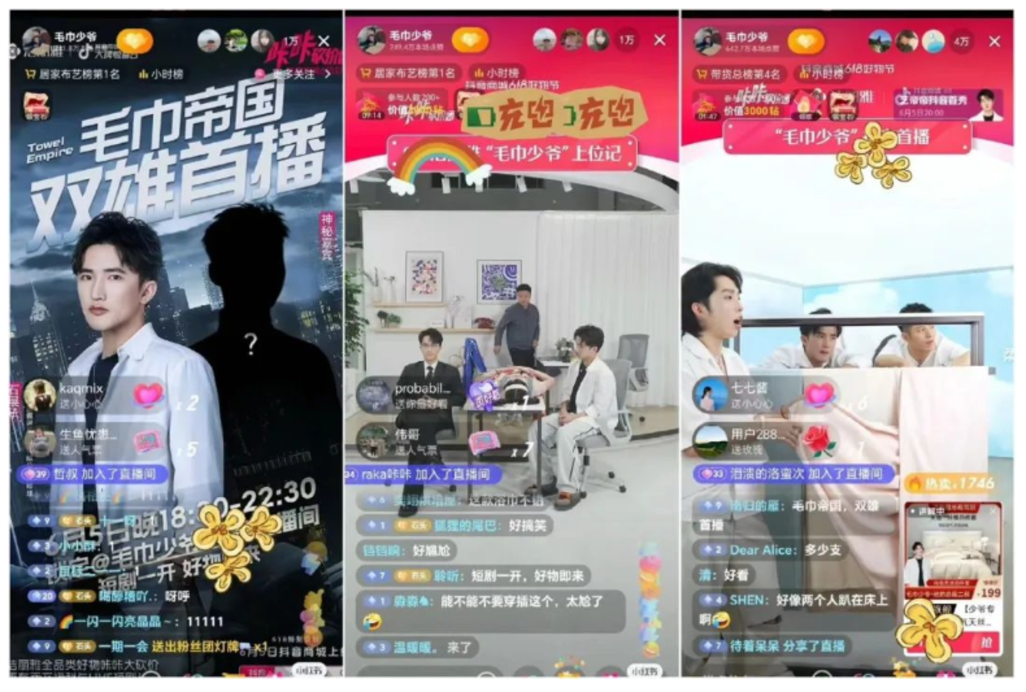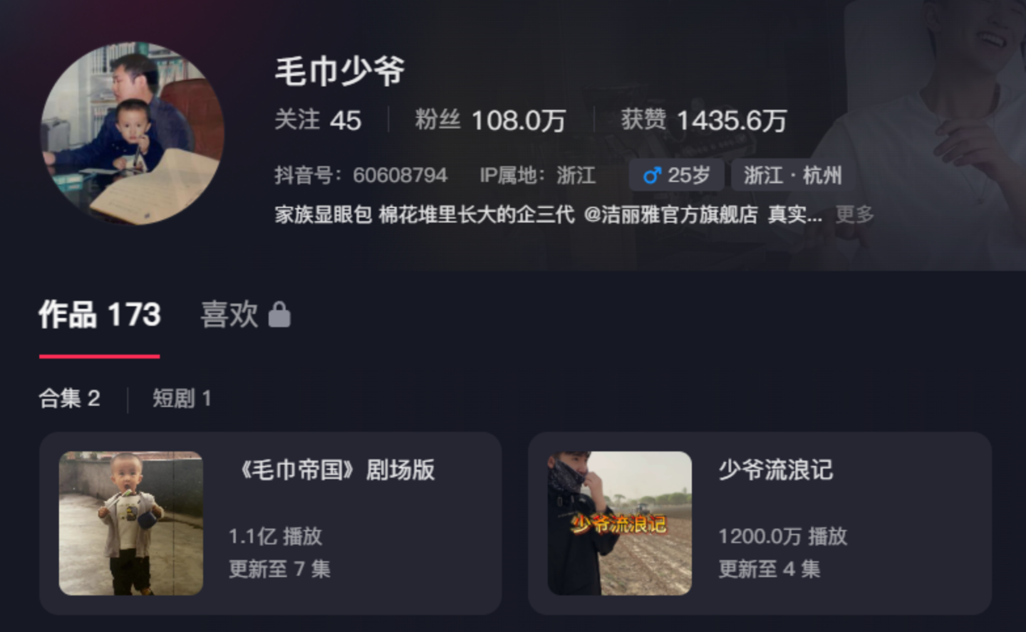 在今年上半年,洁丽雅三代接班人“毛巾少爷”也凭借着在抖音发的自制“小短剧”走红。截至目前,这部由洁丽雅少爷自编自导自演的《毛巾帝国》累计播放量已经达1.1亿,单条短视频的最高点赞数高达156.6W,还曾多次登上抖音热搜TOP1。而另一部《毛巾帝国之时光如梭》播放量也能达633W,实现了较为有效的曝光。