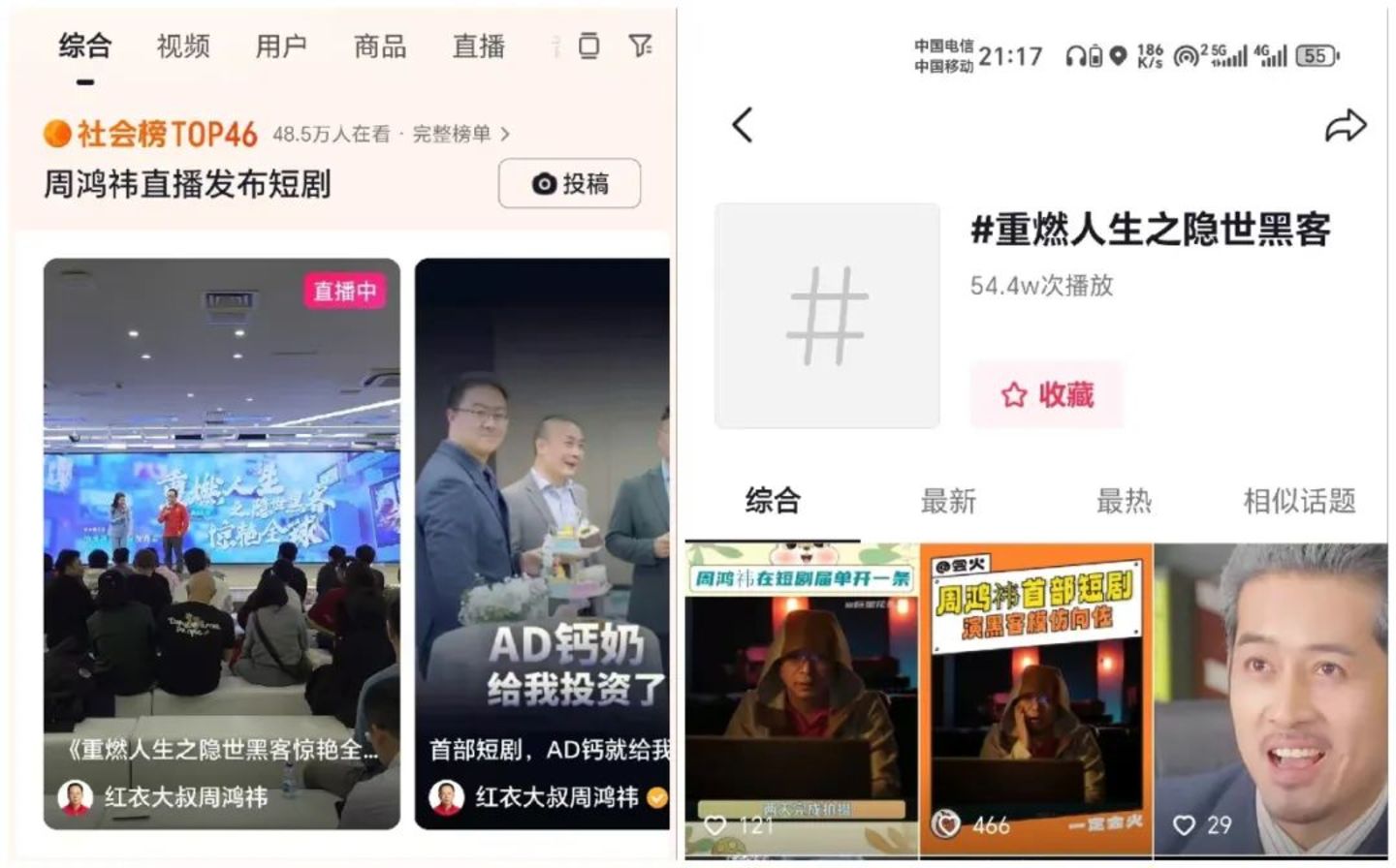 而从发布后的传播效果来看,该事件相关词条#重燃人生之隐世黑客,2小时内抖音话题量达54.4W。#周鸿祎直播发布短剧#词条登上抖音社会榜TOP46,近50W人在看。