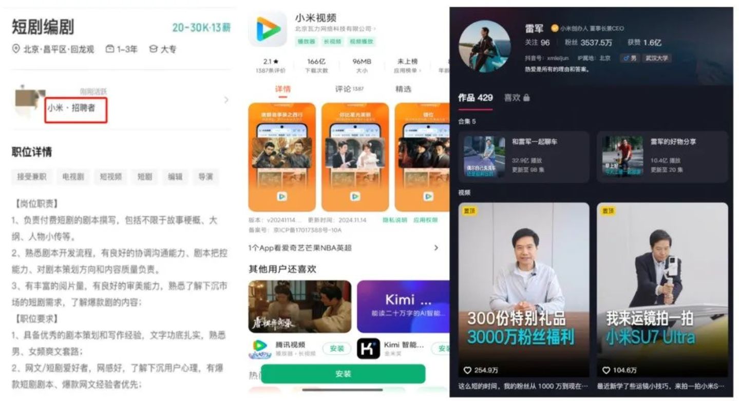 5月初,小米公司发布一则30万招聘短剧编剧的消息,同样引发广大关注。11月15日,DataEye短剧观察在小米应用市场发现,小米短剧APP已经上线。近期,小米总裁雷军更是通过短视频和直播等方式,以“人格魅力”吸引了大批粉丝。